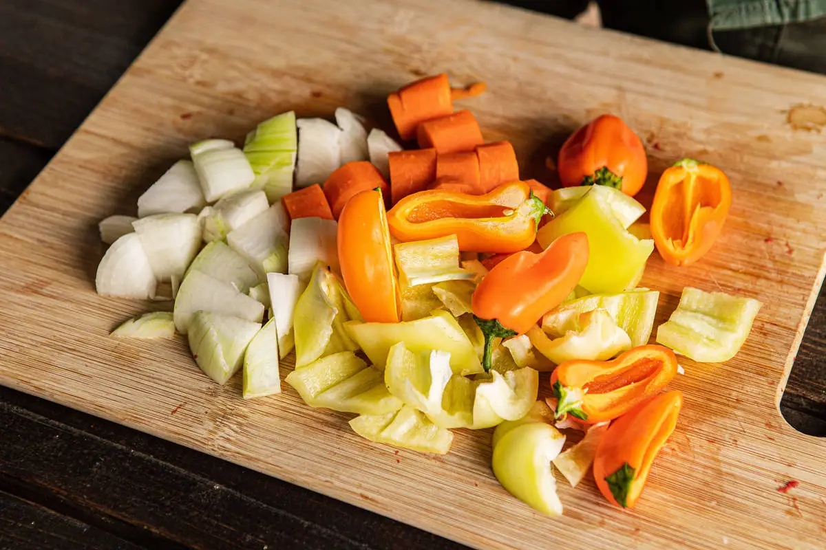 Лук и морковь очистите. Лук нарежьте крупными кубиками, морковь — толстыми кольцами, болгарский перец — кусочками.
