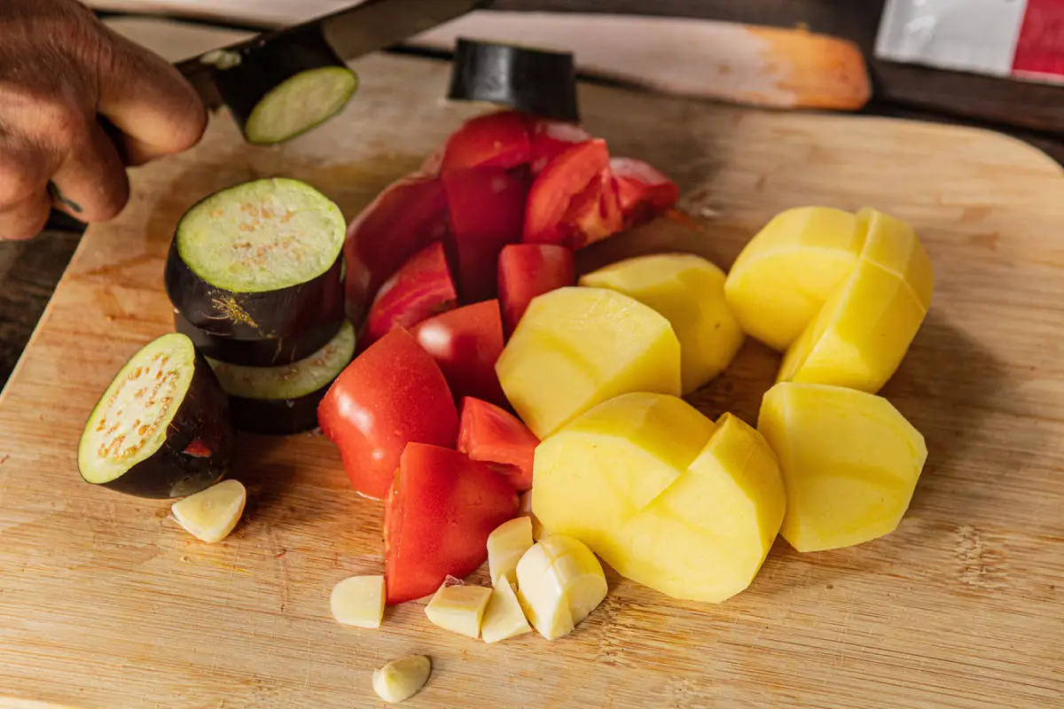 Картофель очистите и нарежьте крупно, баклажан — толстыми кольцами, помидор — кубиками.