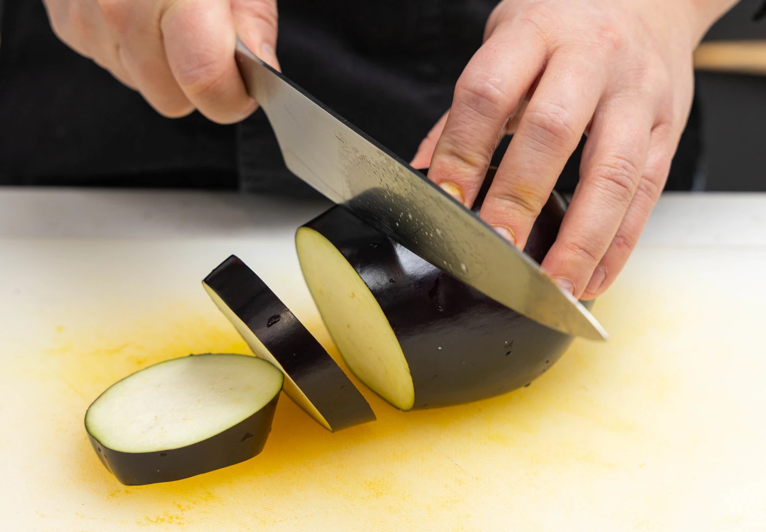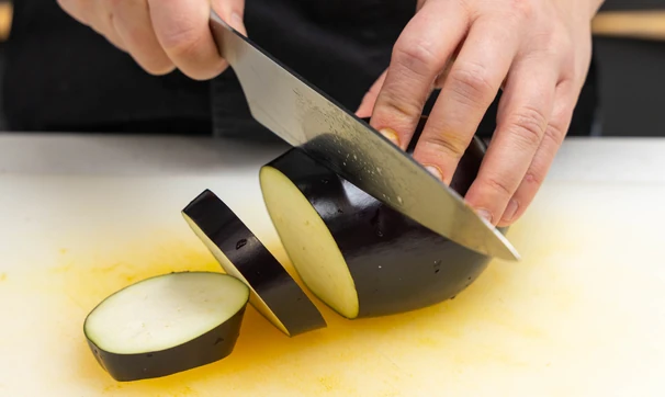 Нарежьте баклажан кружками толщиной 6–7 мм, выложите на противень, выстеленный фольгой или пергаментом, слегка посолите.