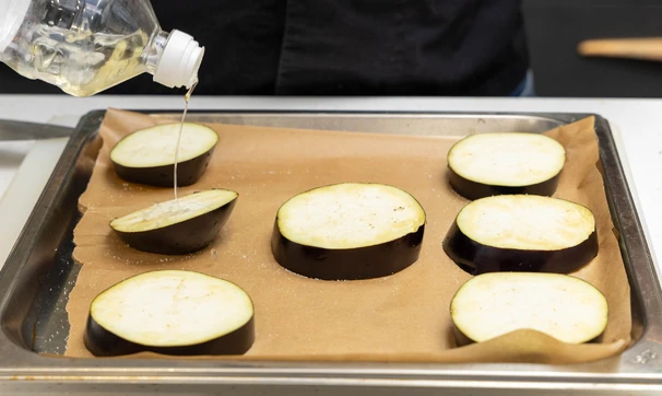Сбрызните растительным маслом и запекайте в духовке, разогретой до 230 °С, в течение 5–7 минут, переверните и готовьте ещё 3–4 минуты. Переложите кружки баклажана горячими в контейнер, накройте крышкой и оставьте на 5 минут.