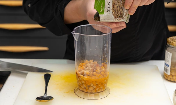 В миску положите нут, добавьте 3–4 ст. л. жидкости из банки и пряности, перемешайте, разминая вилкой. Посолите и поперчите по вкусу.