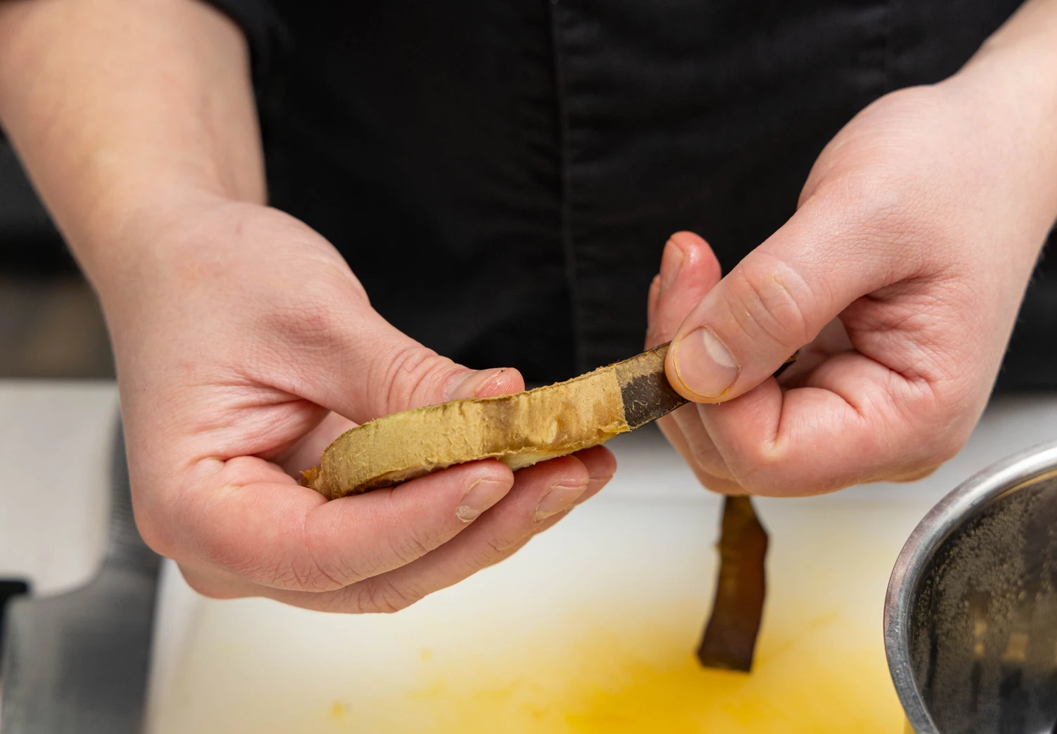 Снимите кожицу с ломтиков баклажанов, добавьте тёртый чеснок, лимонный сок, тахини и щепотку соли. Взбейте все ингредиенты блендером до однородности.