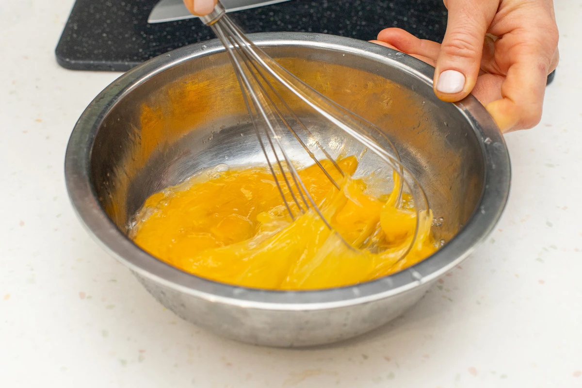 Разбейте яйца в мисочку, посолите, взбейте венчиком в однородную массу.