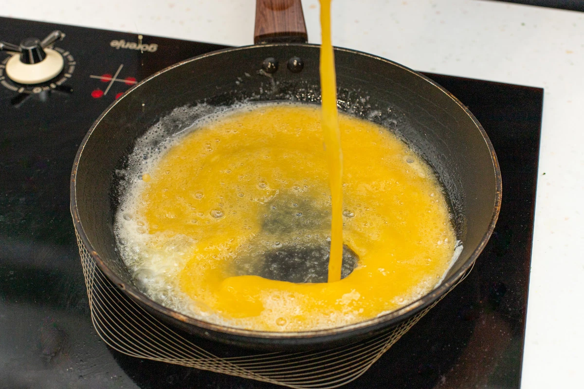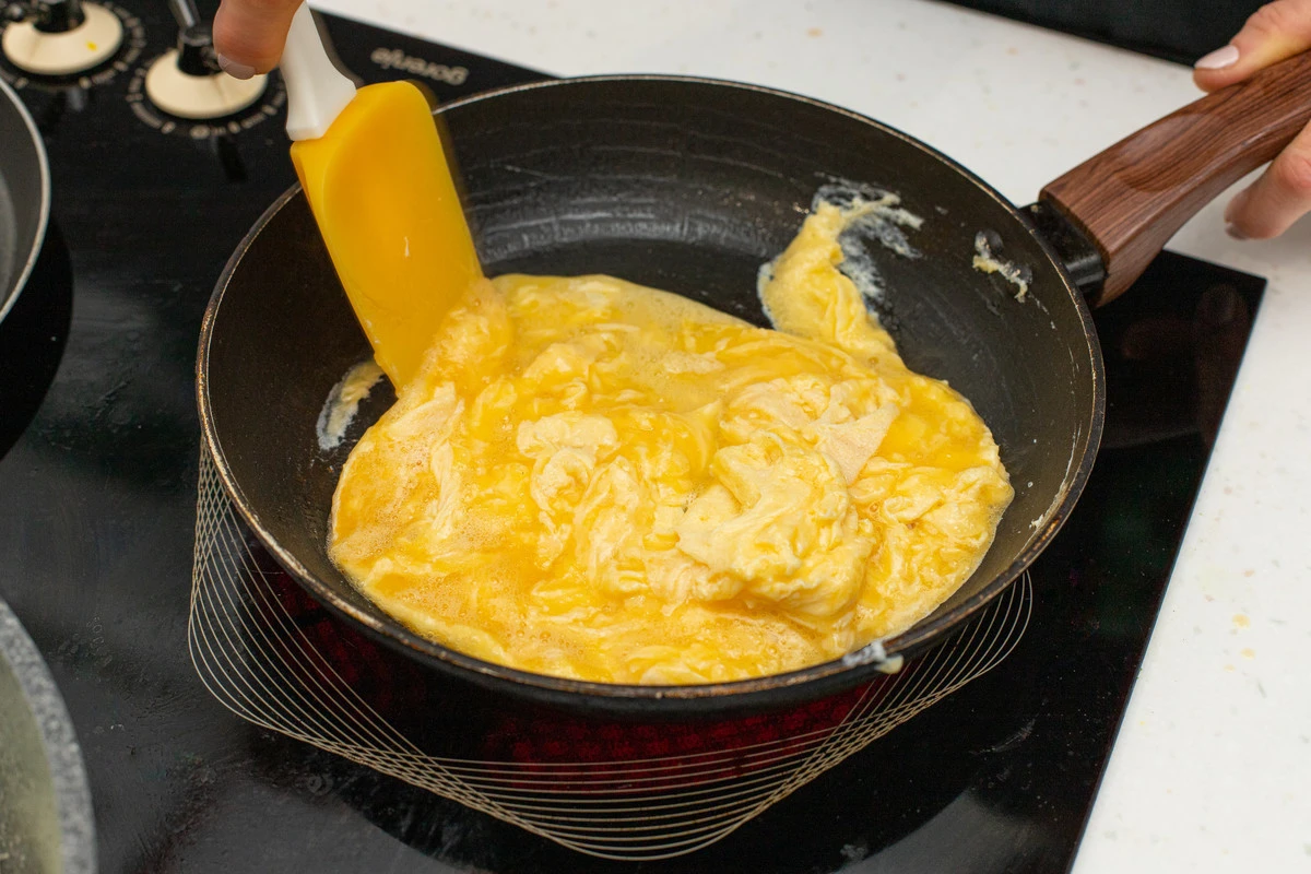 Вылейте яйца в сковороду. Дайте им чуть-чуть схватиться и сразу начинайте перемешивать лопаткой, не давая превратиться в плотный омлет.