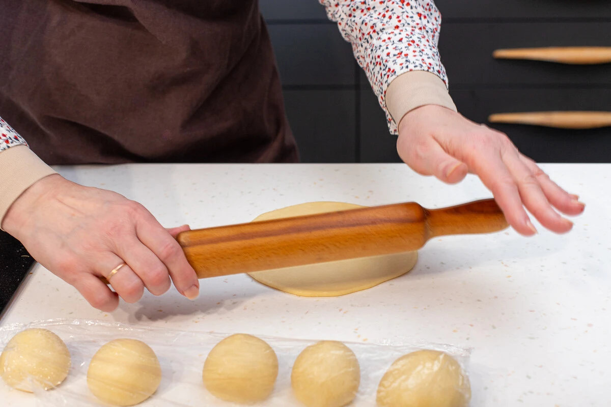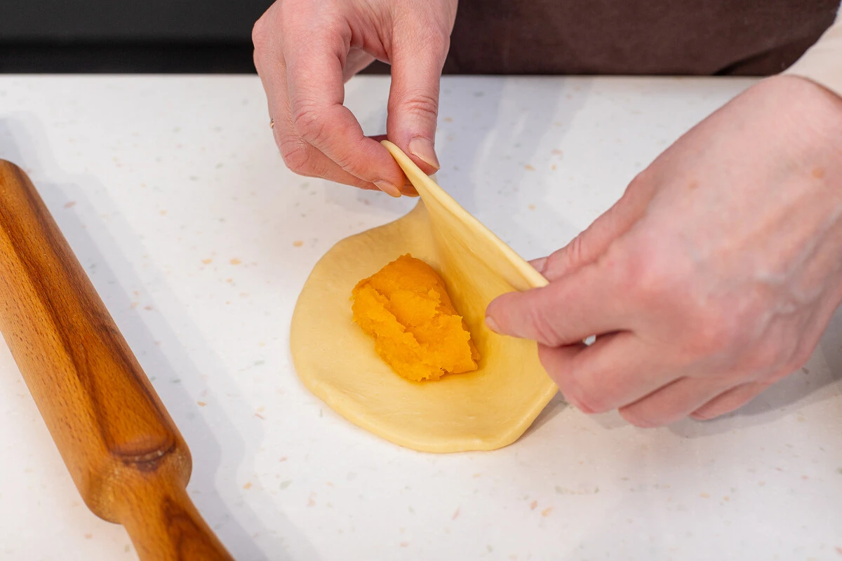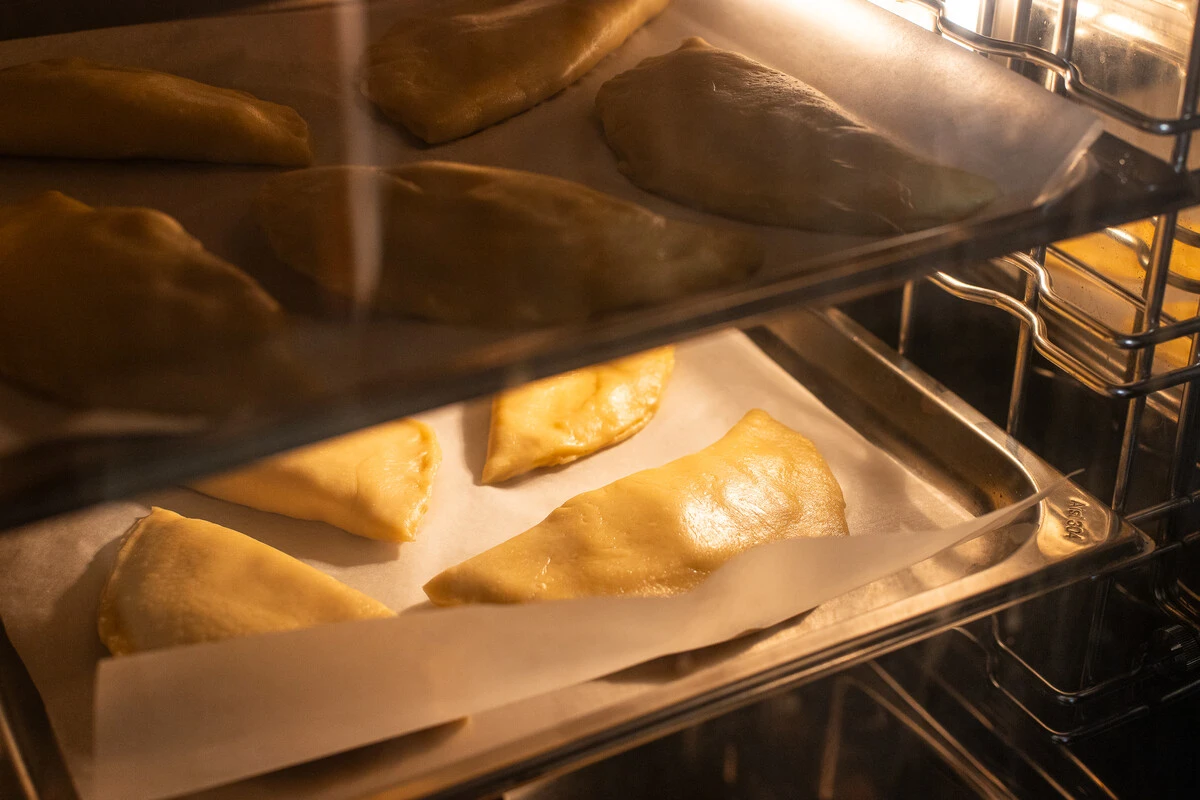 Выпекайте пирожки в духовке при температуре 180 градусов. Сначала готовьте 5 минут на нижнем уровне, затем переверните и запекайте ещё 5 минут на верхнем уровне до золотистой корочки.