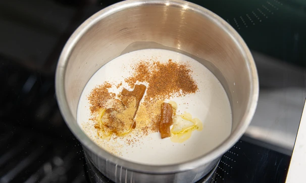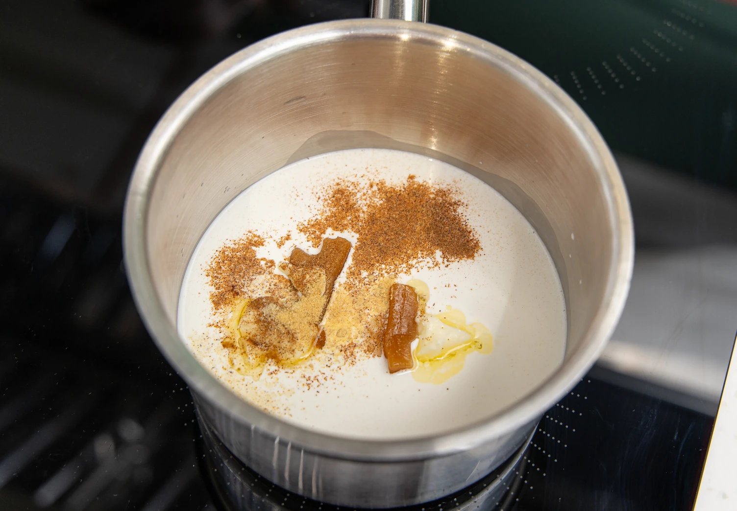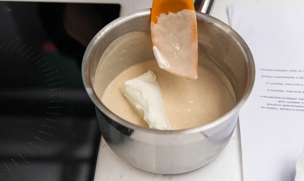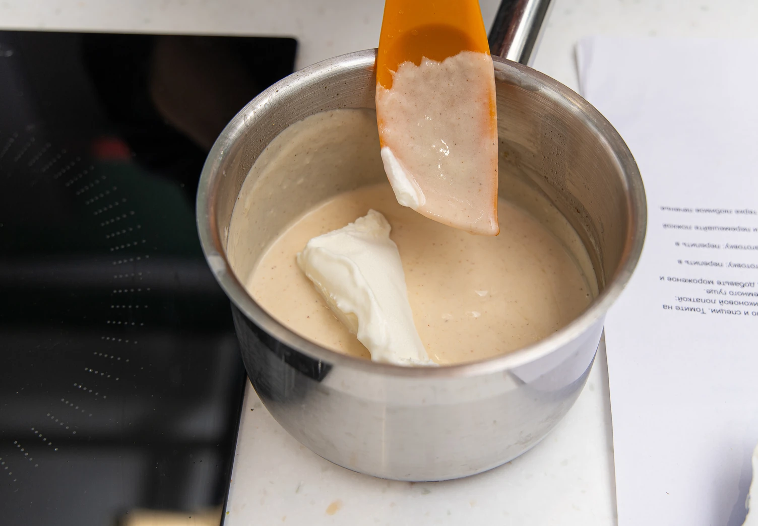 Налейте сливки 20% в сотейник, добавьте ириски, сливочное масло и специи. Томите на медленном огне 10–15 минут, периодически помешивая силиконовой лопаткой: ириски должны полностью раствориться, а сливки — стать немного гуще.