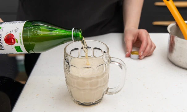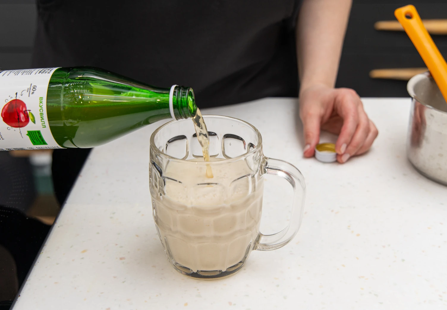 Получившуюся смесь разлейте по стаканам, добавьте сидр и аккуратно перемешайте ложкой.