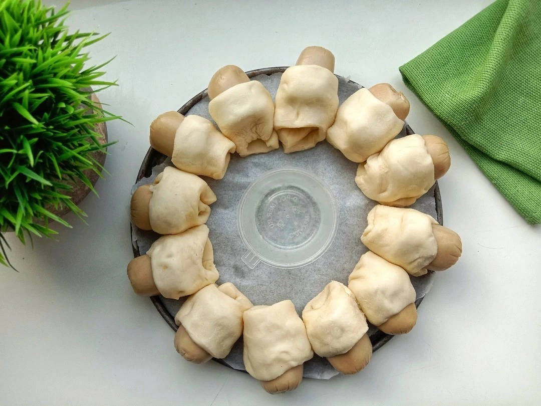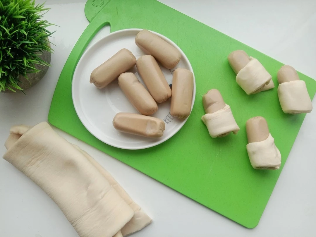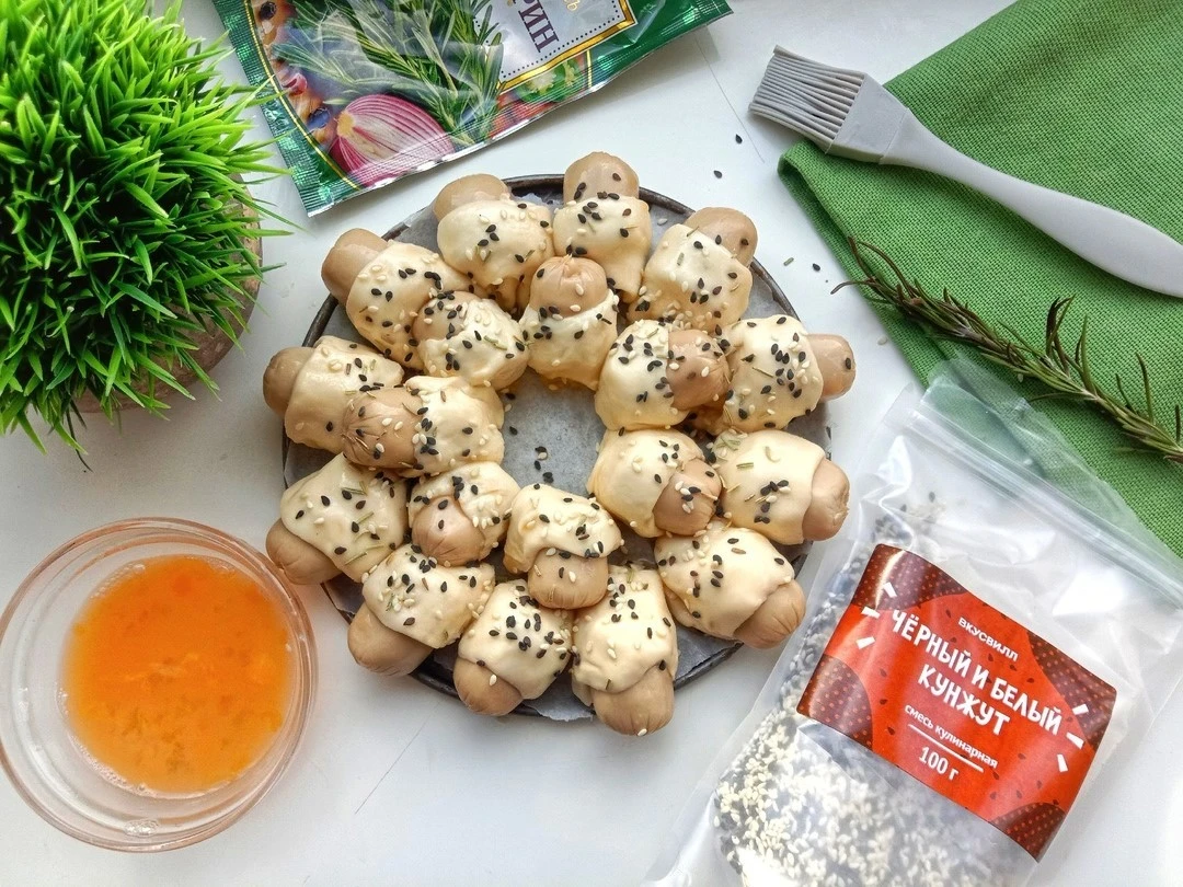 Рецепт «Слоёный пирог «Ромашка» из мини-сосисок с сырным соусом»