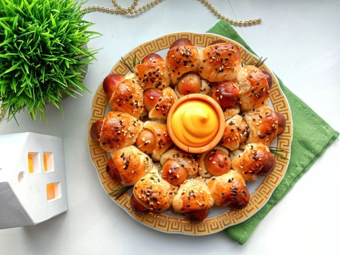 Слоёный пирог «Ромашка» из мини-сосисок с сырным соусом