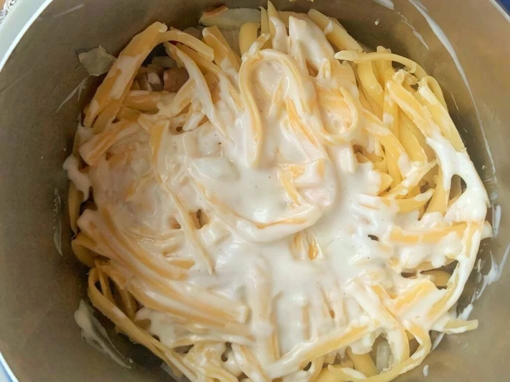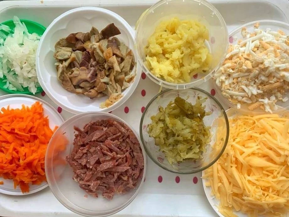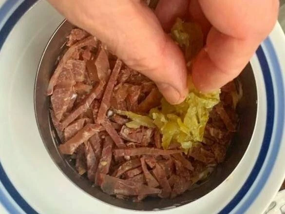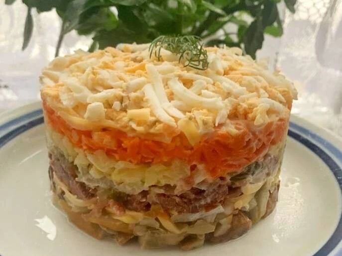 Затем идёт нарезанное мясо, солёные огурцы, майонез, картофель, морковь, сыр, майонез и яйцо.