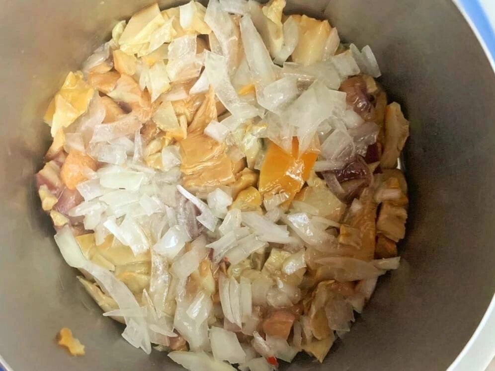 Первым слоем выложите солёные грибы, затем присыпьте их сверху мелко нарезанным луком и немного смажьте растительным маслом.