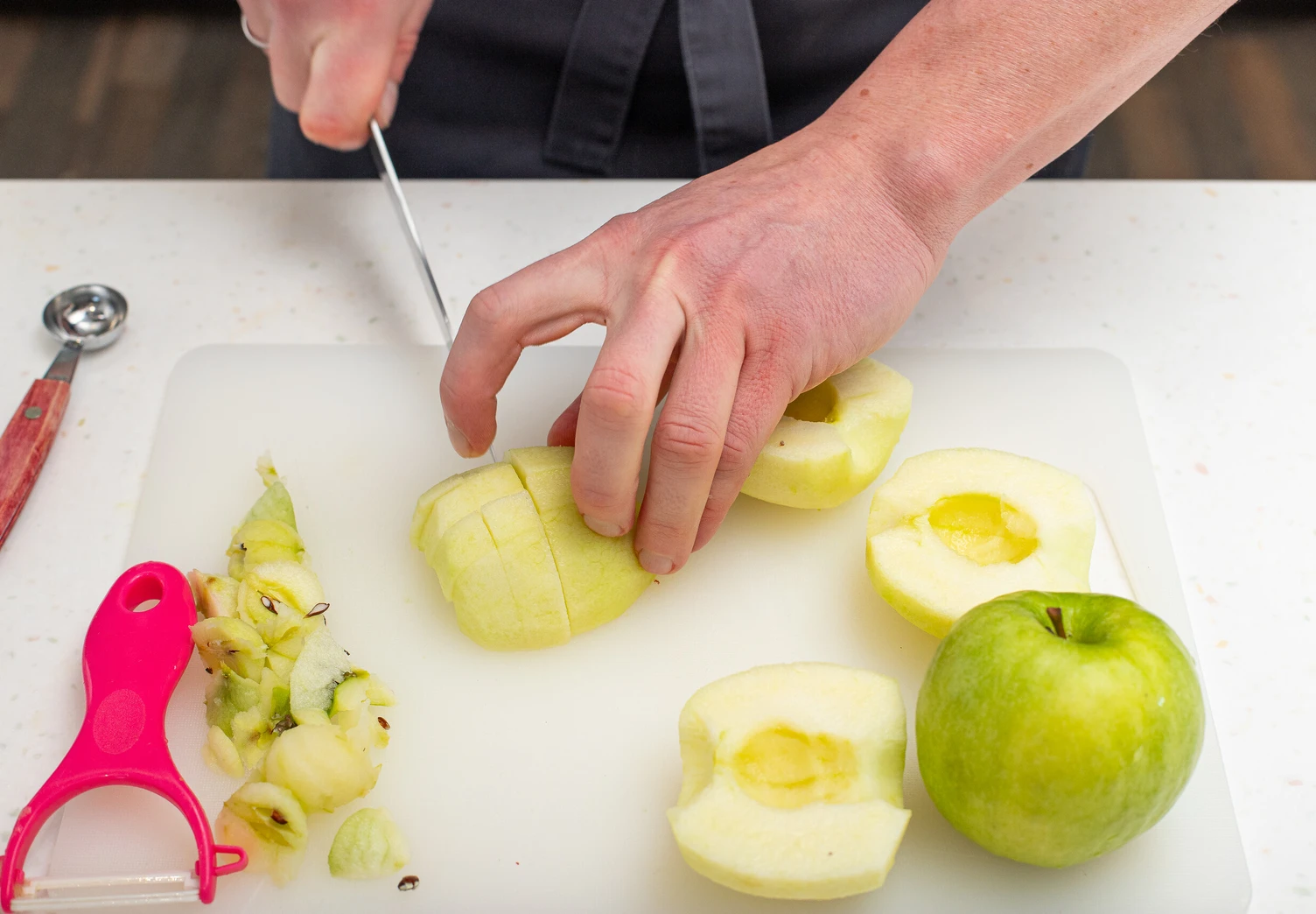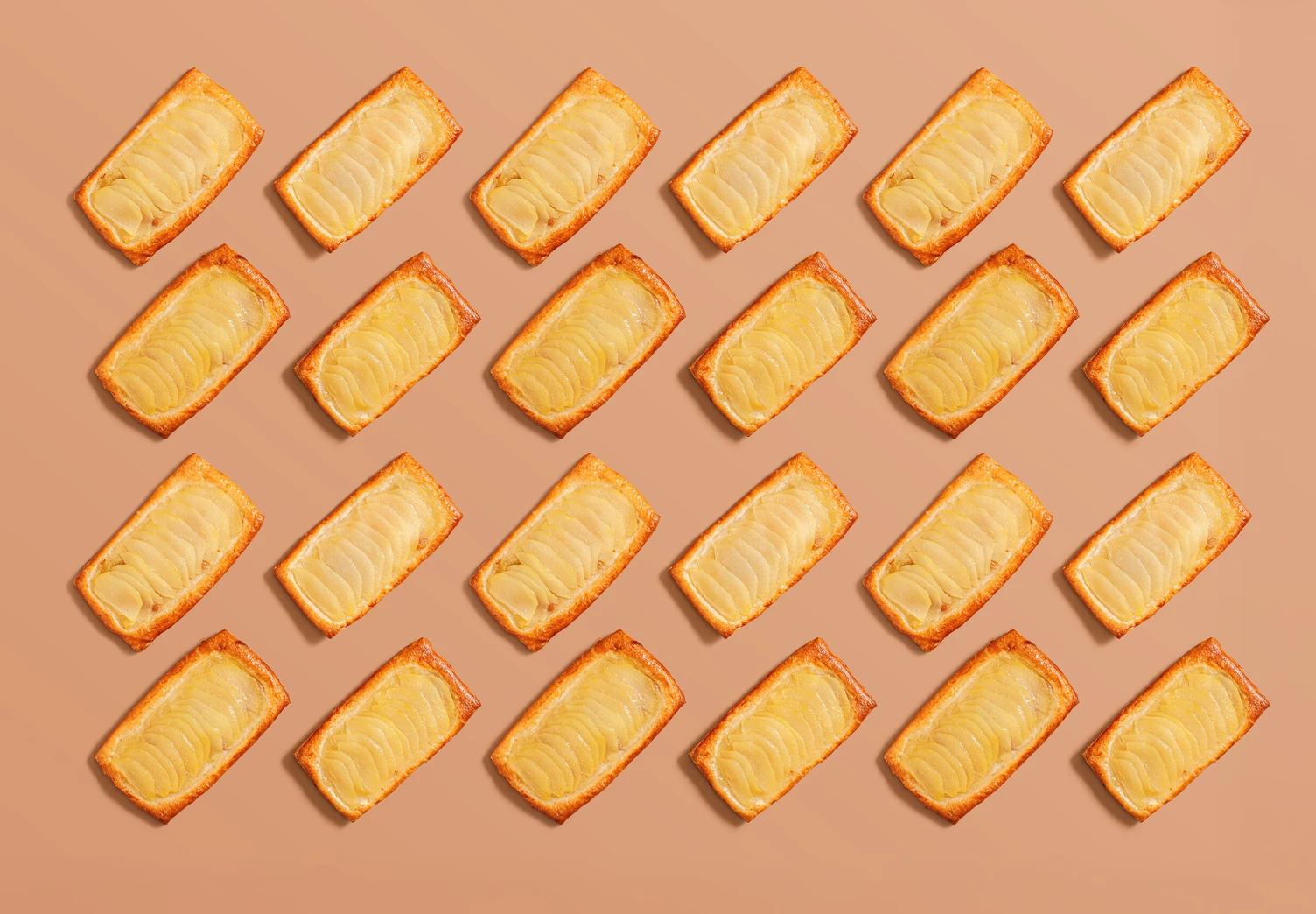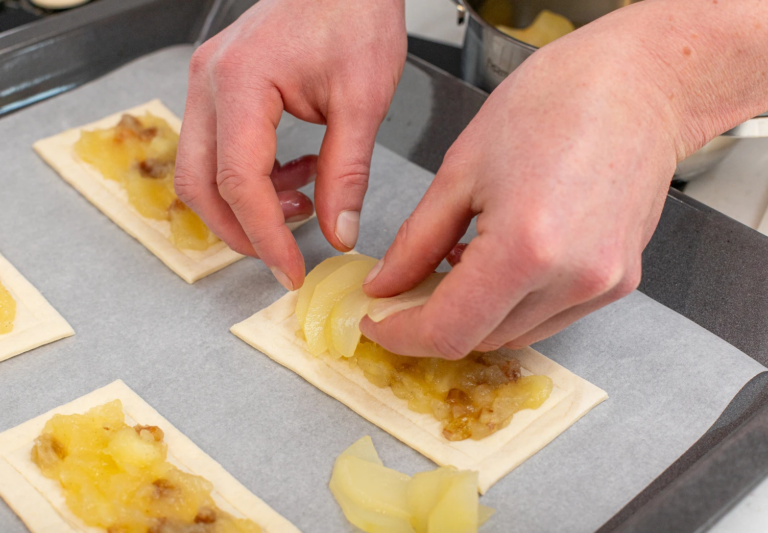 Для открытых слоек разрежьте тесто на прямоугольники размером 6 на 10 см. Затем сделайте неглубокий надрез по периметру каждой заготовки, отступив от края на 1 см. Выложите яблочную начинку и тонкие ломтики груши сверху.