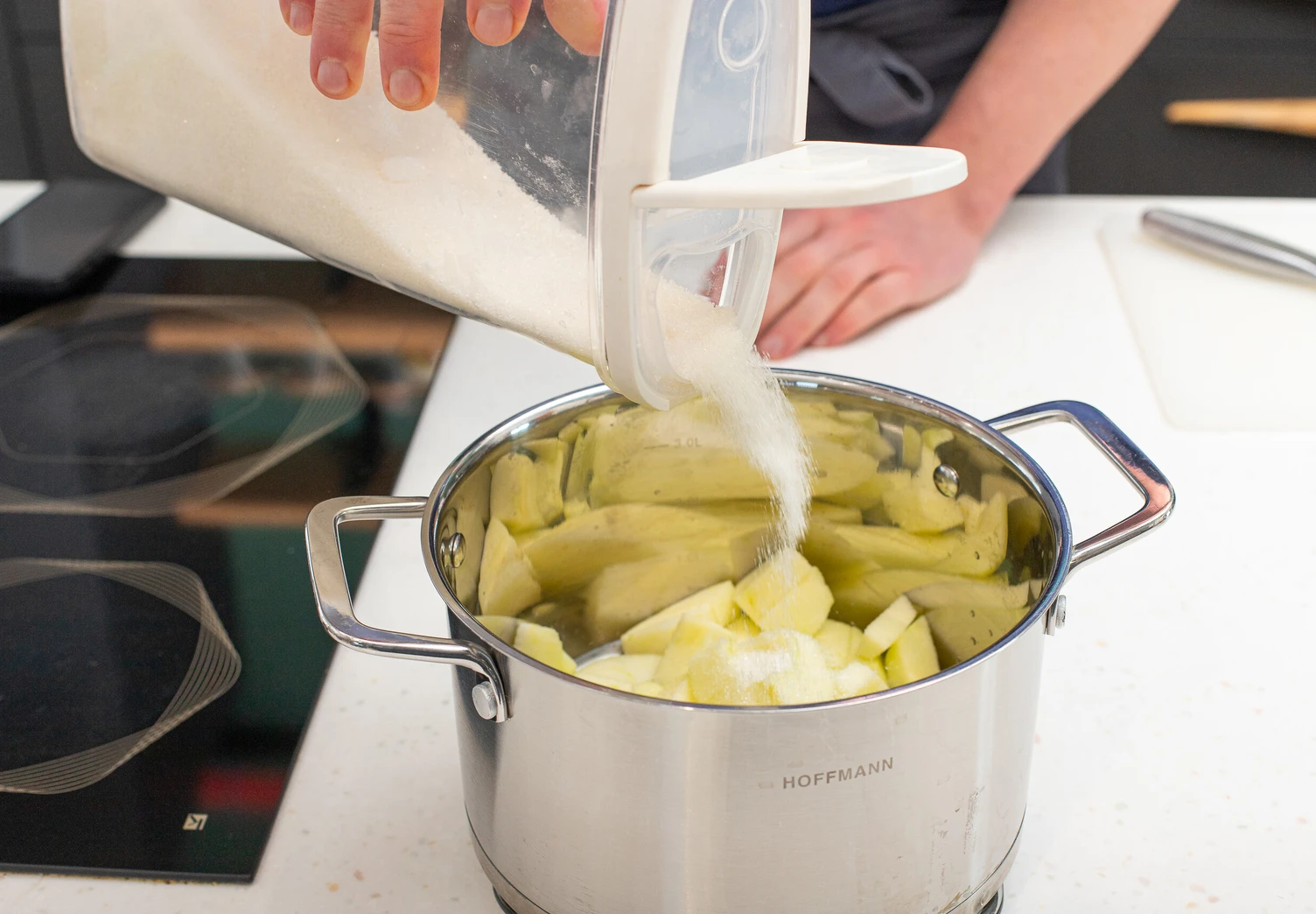 Агар-агар соедините с крахмалом и второй порцией сахара. Подмешайте к яблокам.