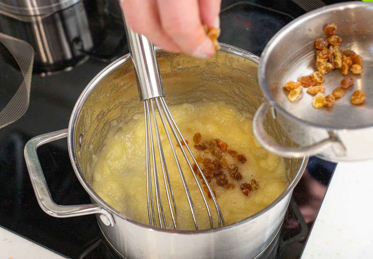 Пробейте массу вместе с сиропом погружным блендером, добавьте изюм.