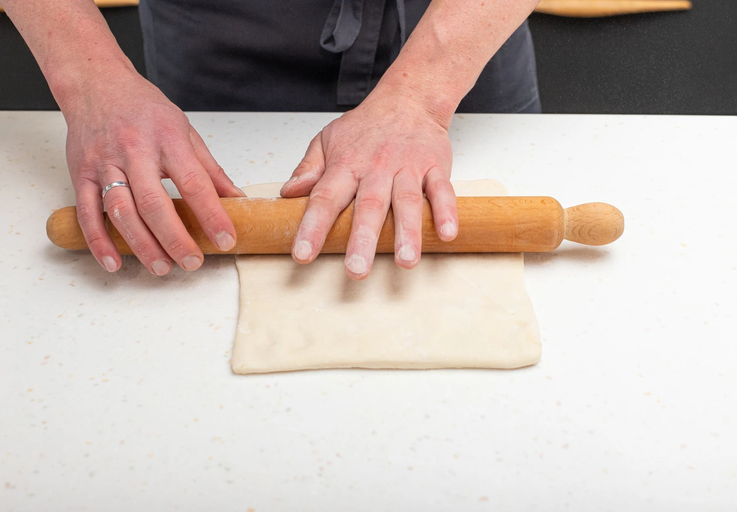 Разморозьте слоёное тесто по инструкции на упаковке и раскатайте в пласт толщиной около 3 мм.