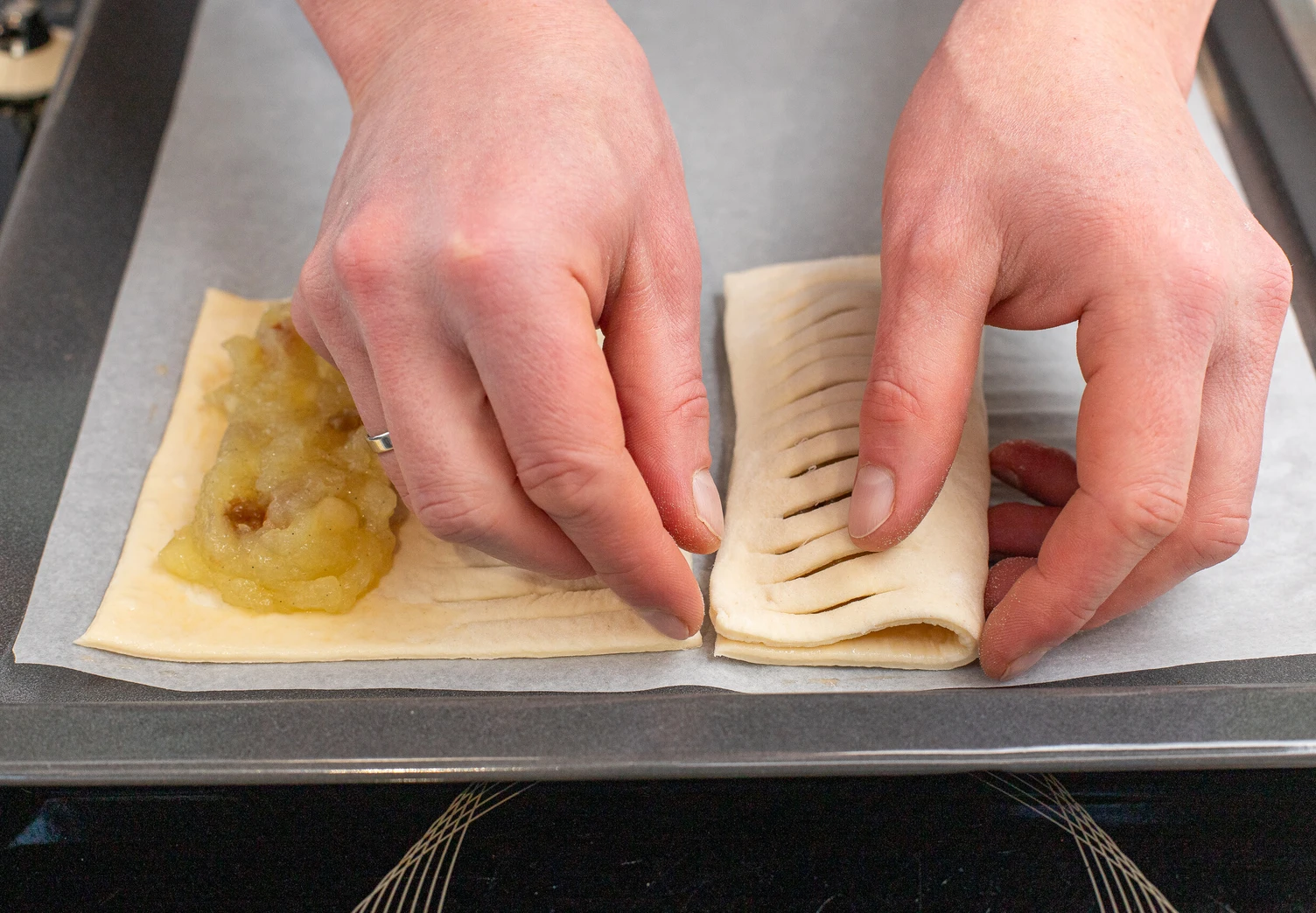 Чтобы приготовить закрытые слойки, нарежьте тесто на квадраты со стороной примерно 12 см. На одной из половинок квадрата сделайте несколько поперечных надрезов. На неразрезанную половину выложите яблочную начинку и тонкие ломтики груши, затем накройте оставшейся частью квадрата.