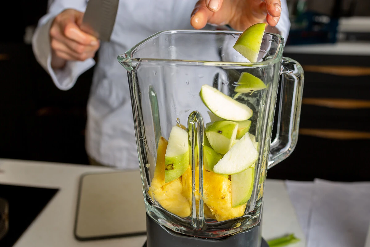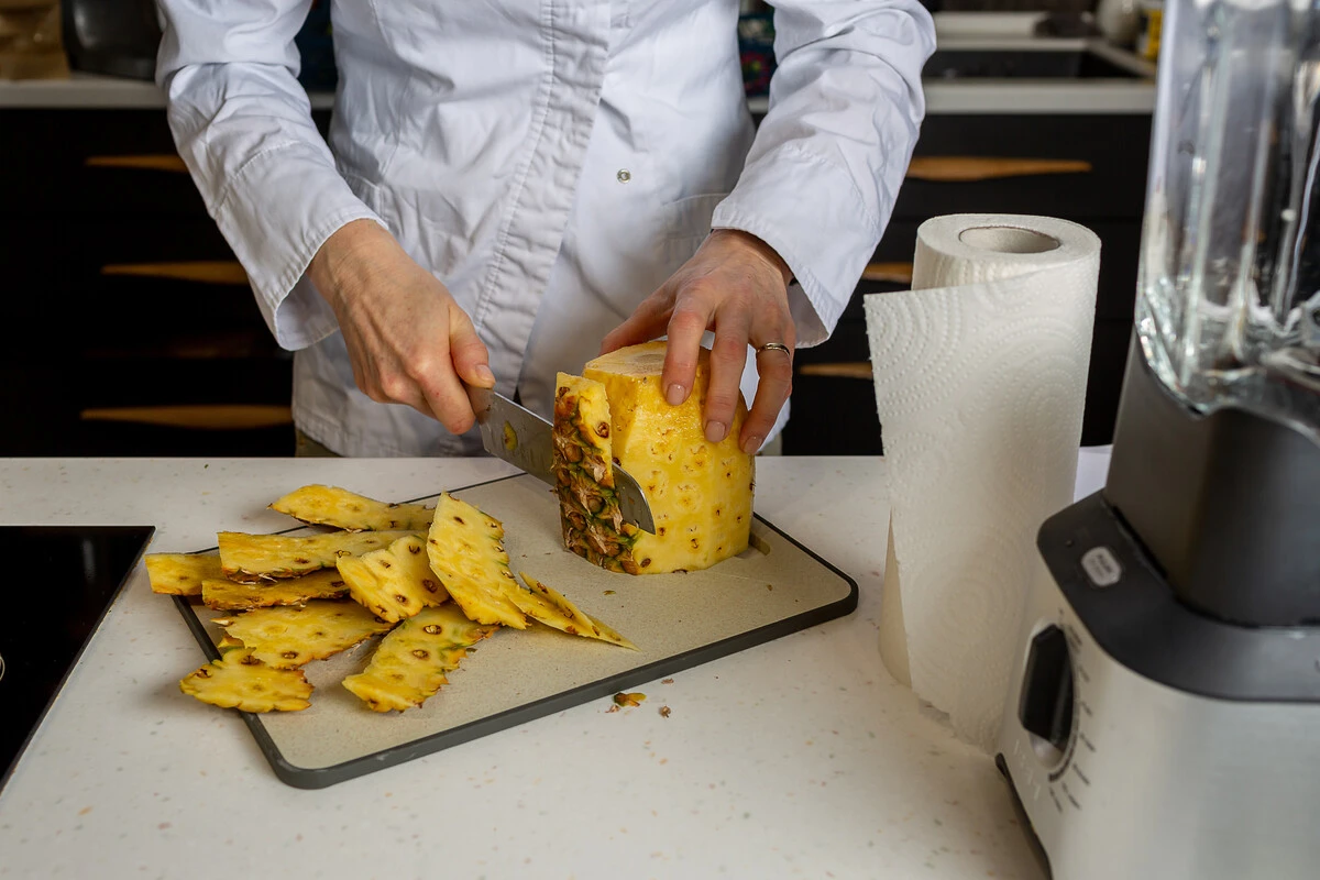 Помойте все овощи и фрукты. Ананас почистите и нарежьте кусочками размером примерно 2х3 см. Положите нужное количество в чашу блендера.