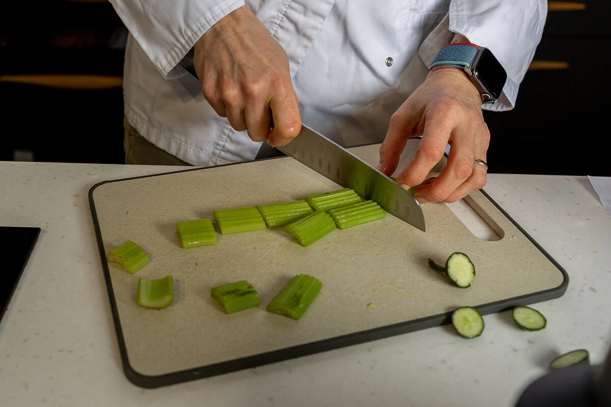 Стебли сельдерея разрежьте на несколько частей и добавьте к остальным ингредиентам.