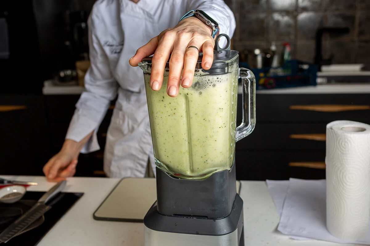 У огурцов срежьте плодоножки и нарежьте плоды шайбами толщиной примерно 1 см или произвольно. Положите в чашу блендера.