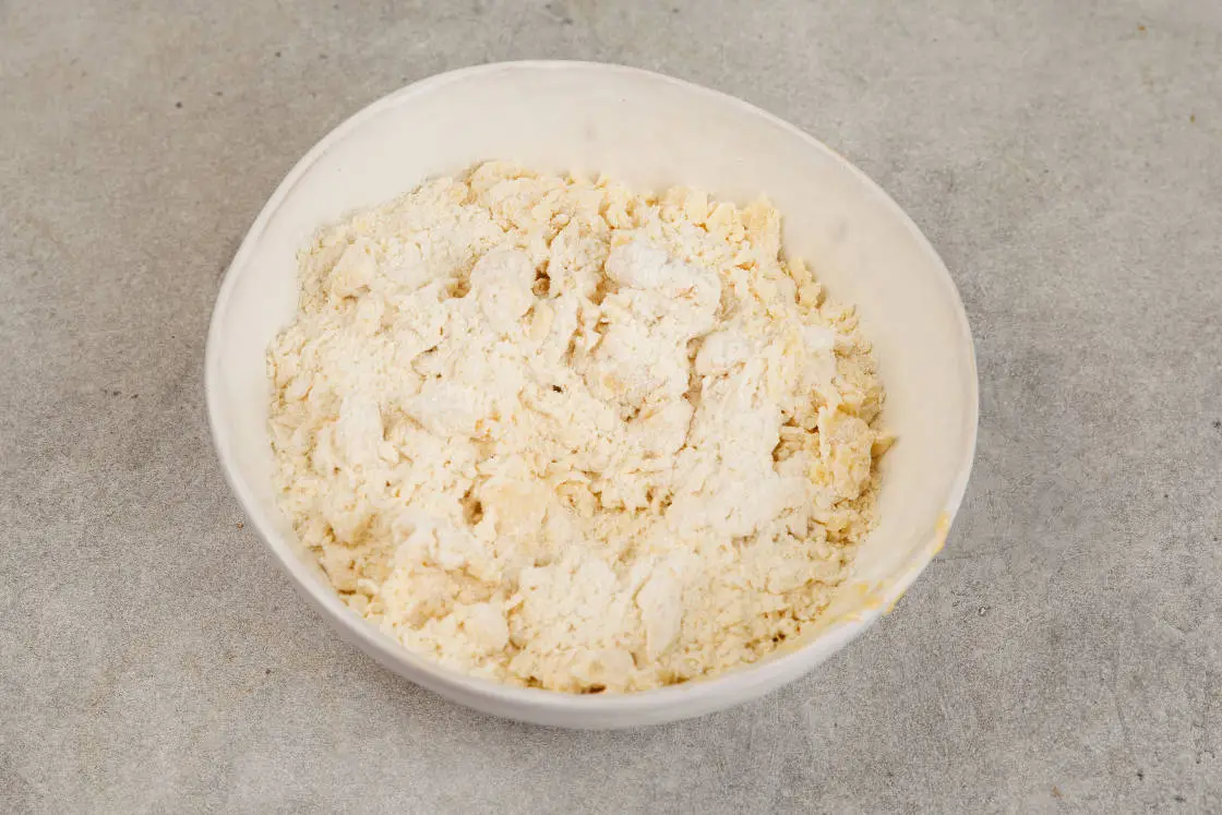 Всыпьте муку и быстро замесите тесто лопаткой. Долго такое тесто месить нельзя, иначе печенье не получится нежным и рассыпчатым.