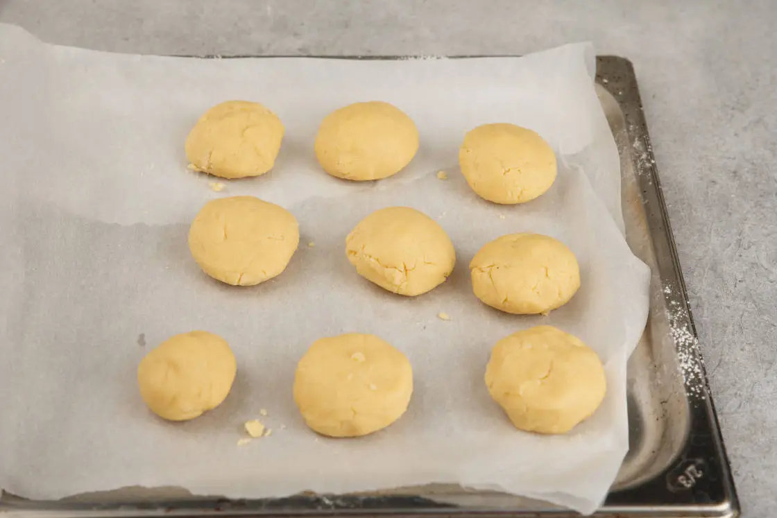 Сформируйте шарики из теста, вкладывая в центр по ореху. Выложите шарики на застеленный пергаментом противень и поставьте в разогретую до 200 °C духовку на 15 минут.