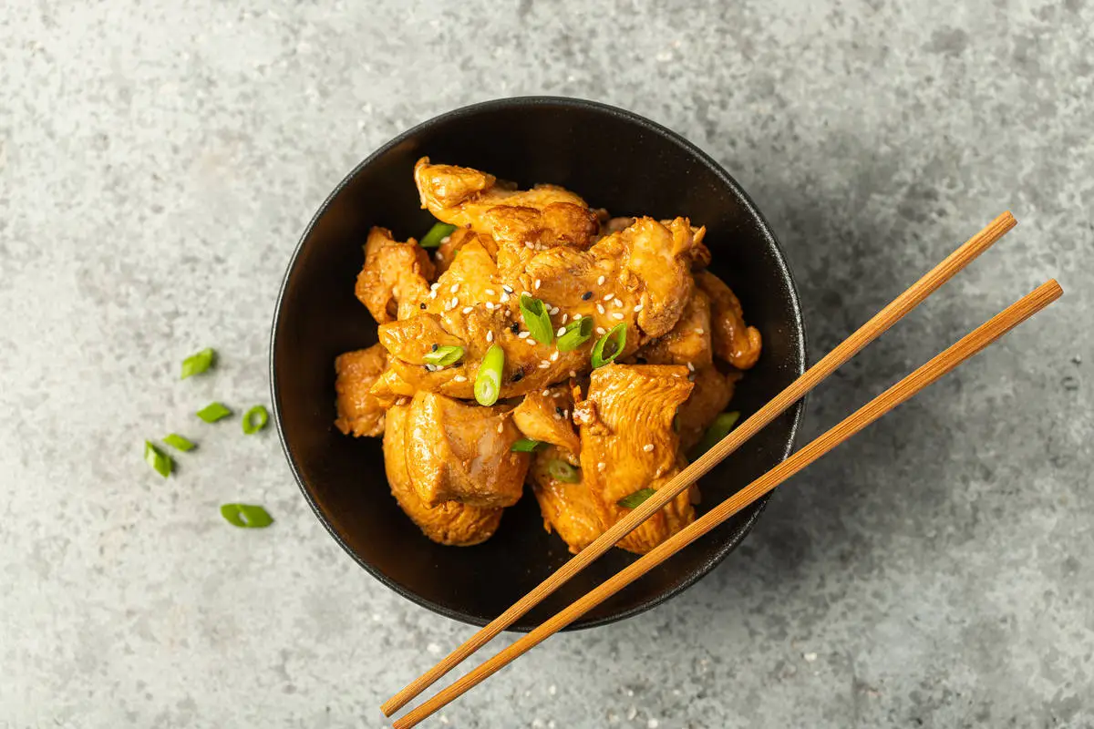 Быстро обжарьте курицу на горячей сковороде на растительном масле примерно по 2-3 минуты с каждой стороны. Огонь должен быть сильным. Подавайте, посыпав кунжутом и резаным зелёным луком или кинзой.