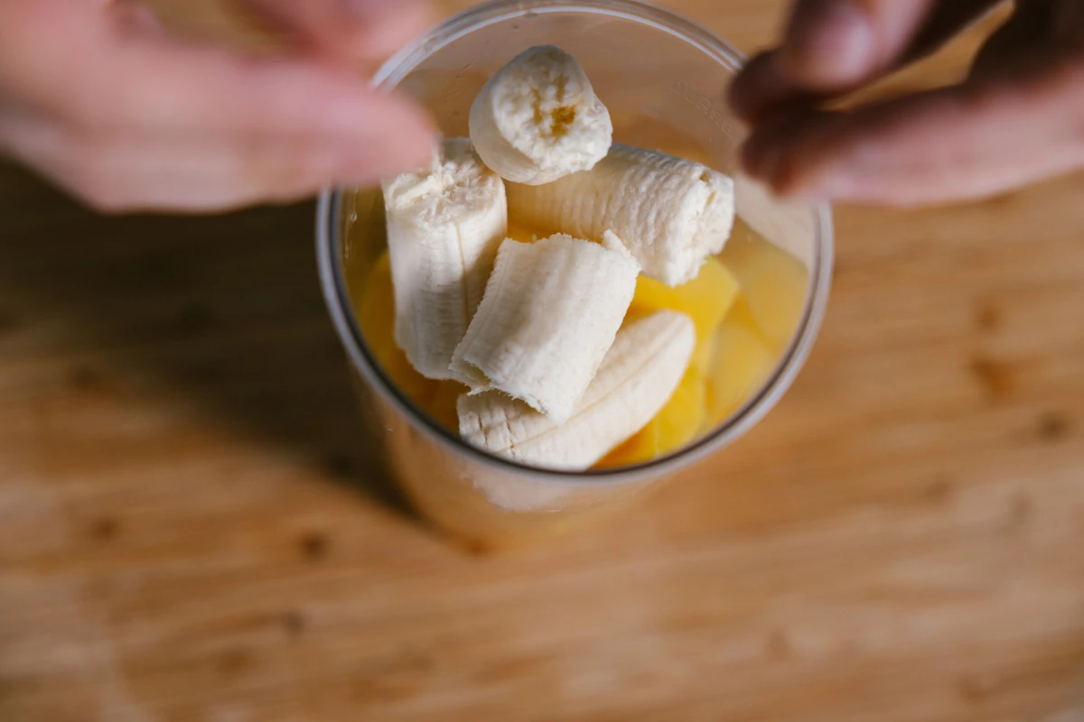 Мякоть манго, банана, имбиря отправьте в блендер.