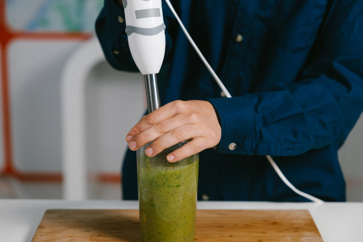 Добавьте шпинат. Из лайма и апельсина выдавите сок и добавьте к фруктам. Если пюре окажется слишком густым, можно добавить немного воды.