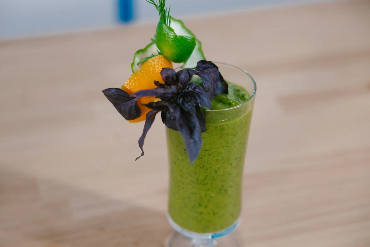 Перелейте смесь в стакан, украсьте розмарином и базиликом.