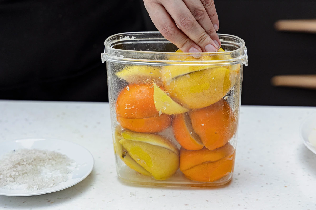 Складывайте лимоны в банку, тщательно утрамбовывая. Лимоны должны максимально плотно заполнять банку, сверху выделившийся сок, а пузырьков воздуха быть не должно. Закройте банку крышкой и оставьте в темном месте при комнатной температуре на две-три недели.