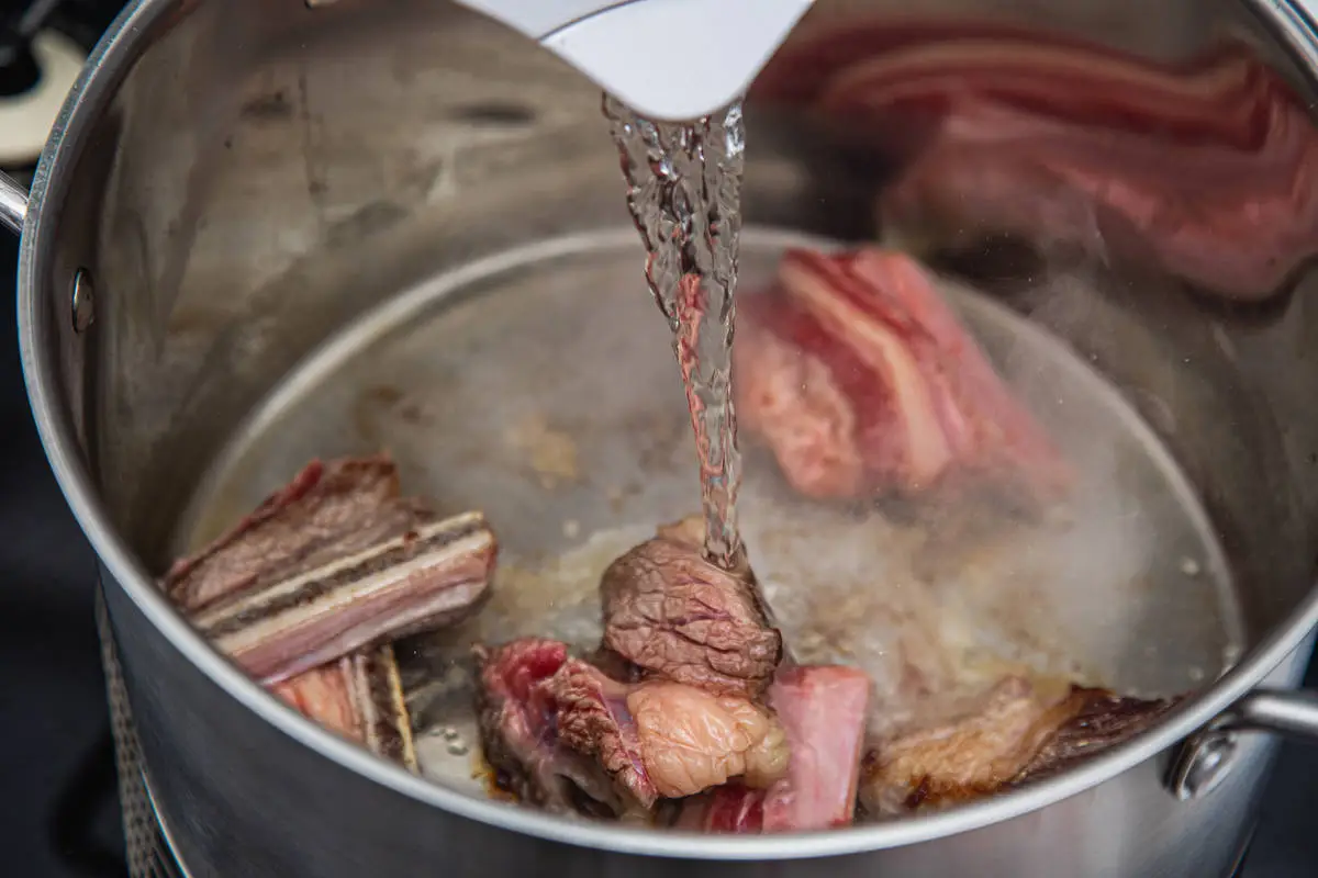 Залейте 3 литрами воды. Доведите до кипения, снимите пену. Варите на небольшом огне около 40 минут.