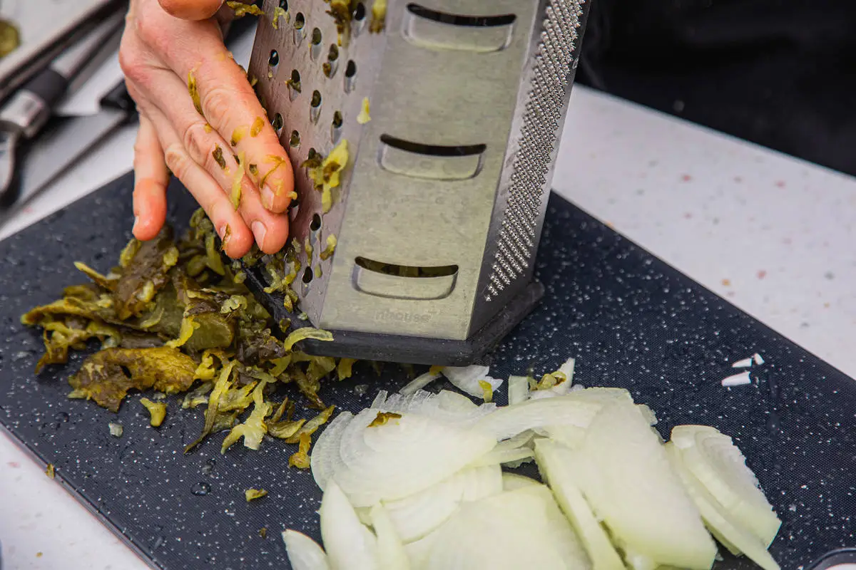 Солёные огурцы натрите, предварительно отрезав кончики.