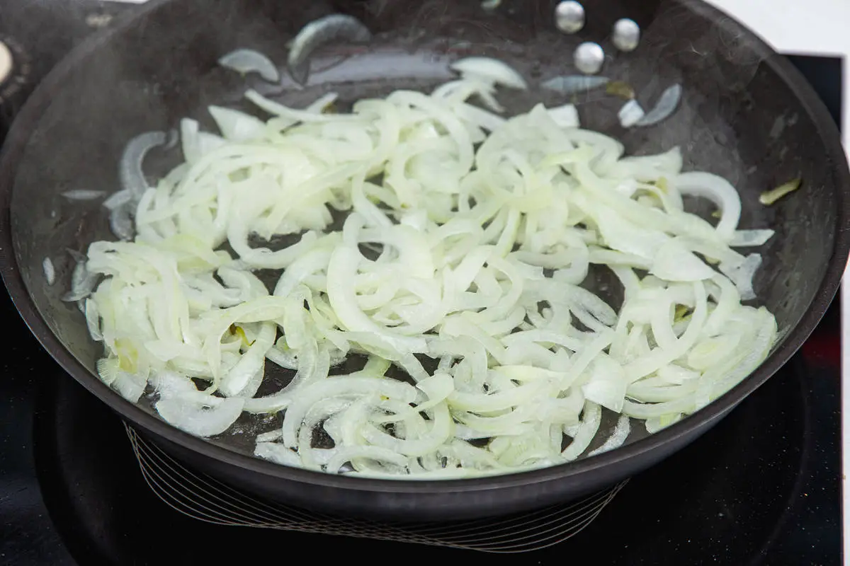 Для зажарки обжарьте лук на сковородке до прозрачности.