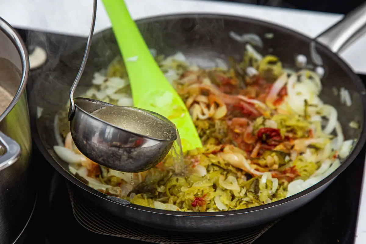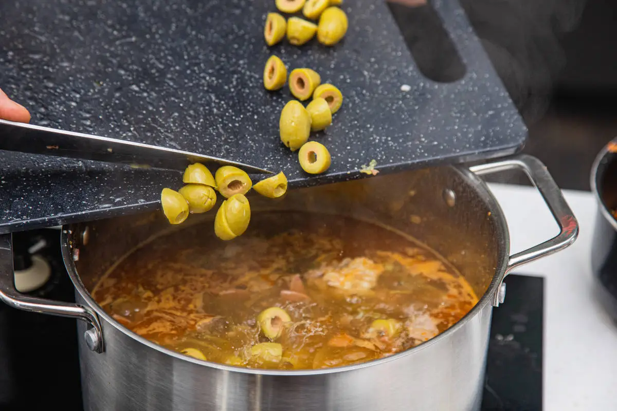 В конце добавьте оливки, поперчите, доведите до кипения и выключите огонь.