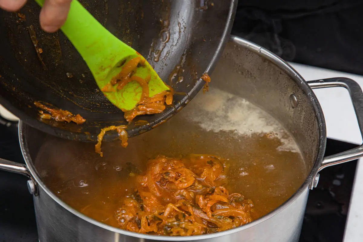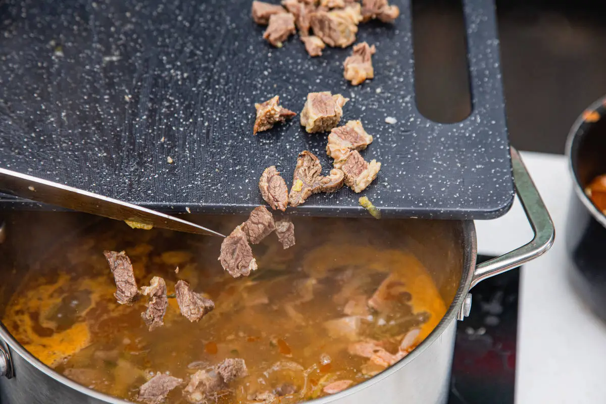Из бульона выньте рёбра. Срежьте мясо с костей, нарежьте его мелко и верните в бульон.
