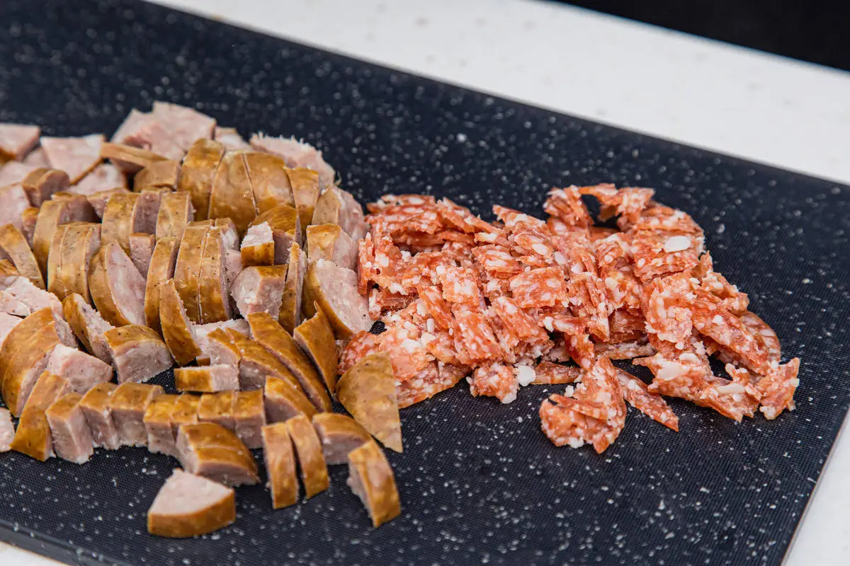 В рецепте используются товары из категорий: Консервация; Овощи, фрукты, ягоды, зелень; Масла, соусы, специи, сахар и соль; Здоровье; Мясо, птица; Колбаса, сосиски, деликатесы; Молочные продукты, яйцо