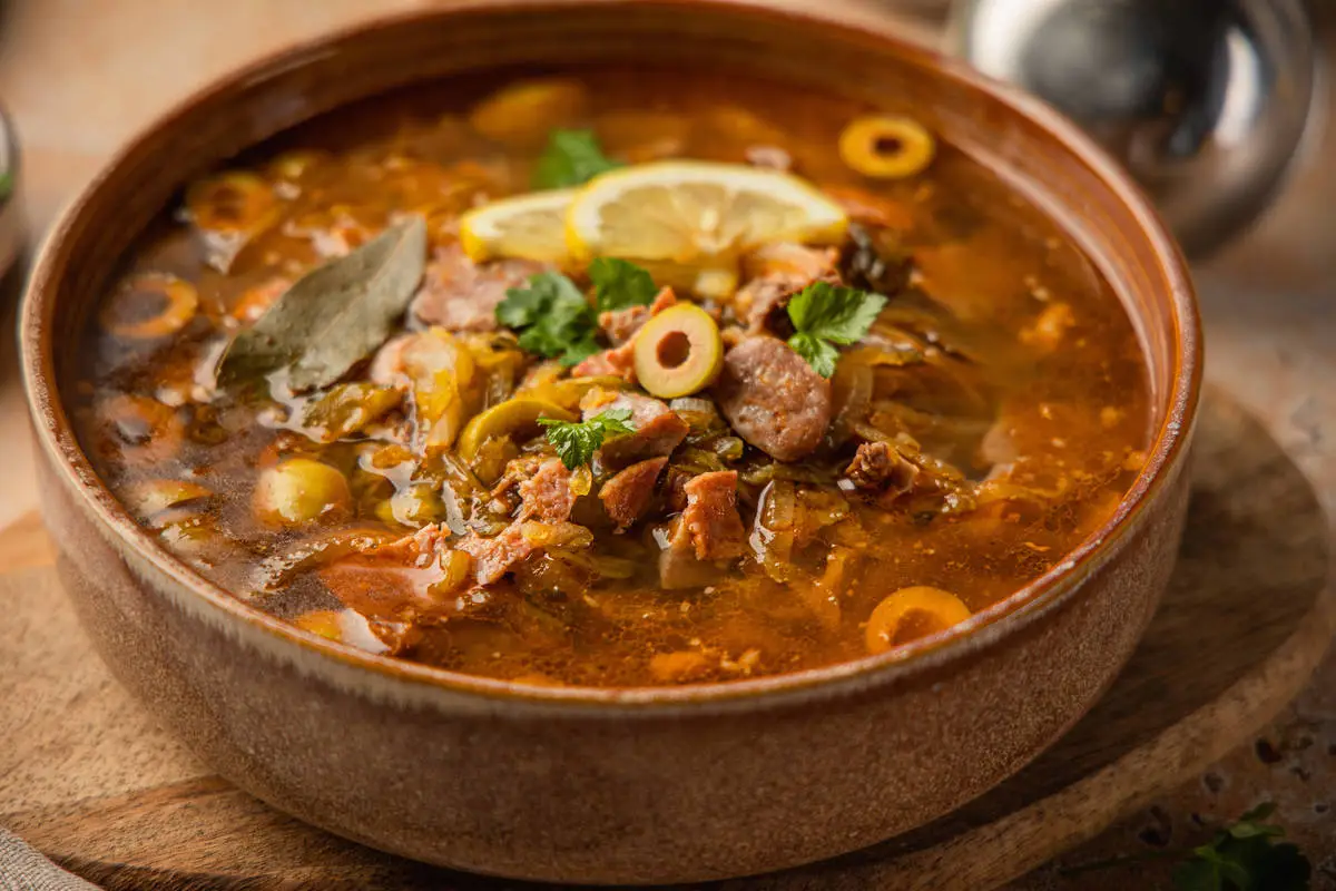 Подавайте солянку горячей с петрушкой, долькой лимона и сметаной.