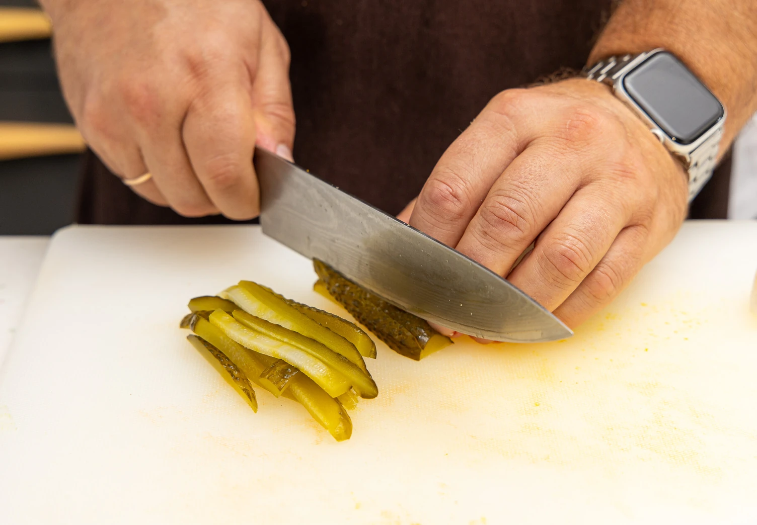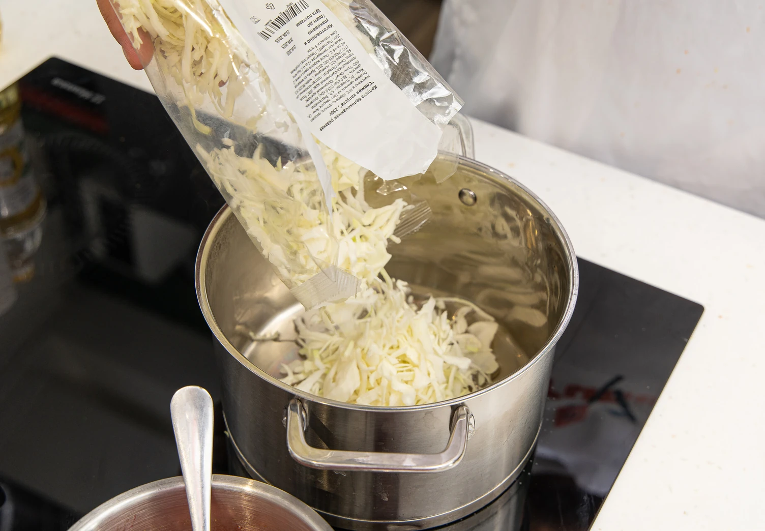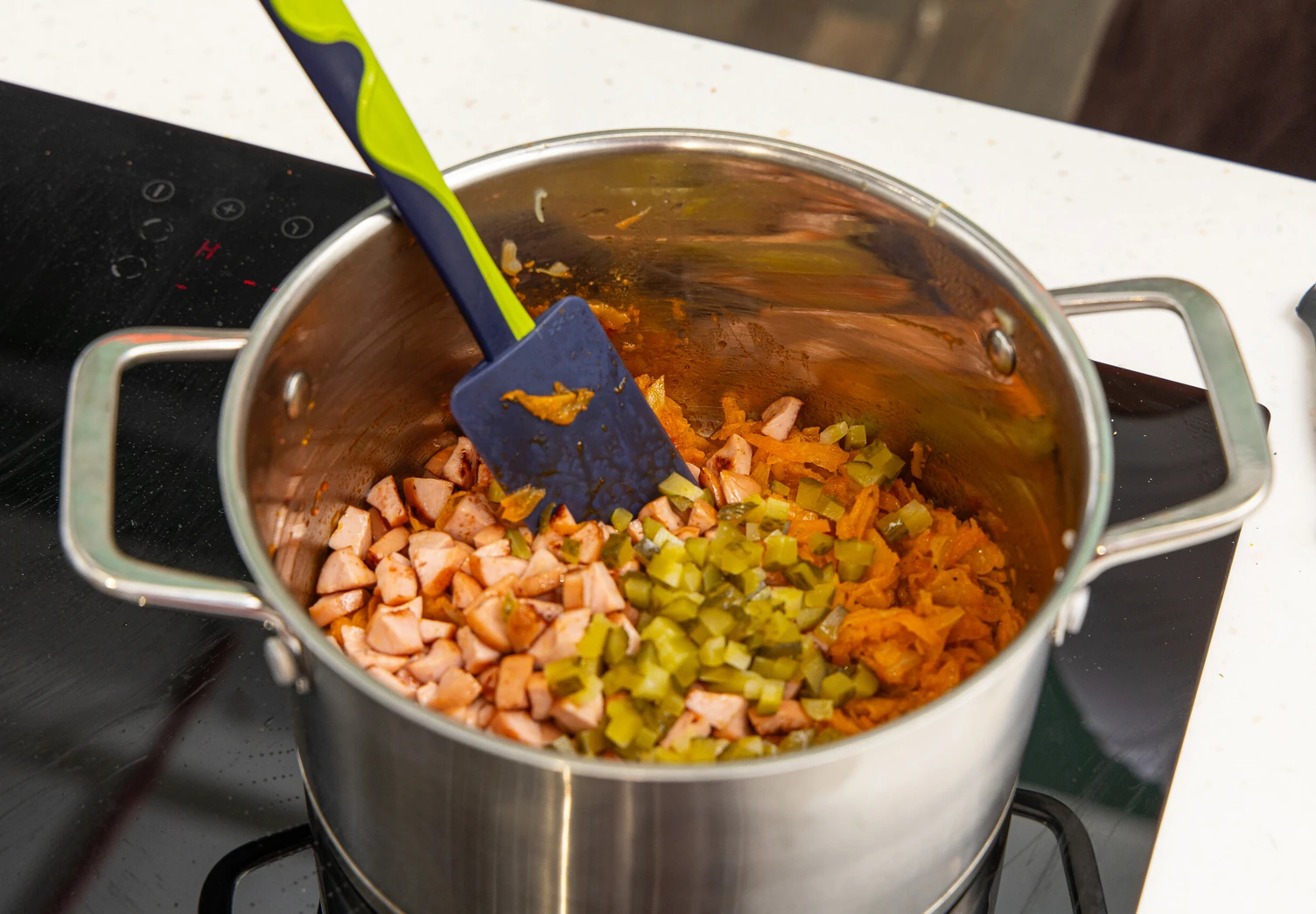 Добавьте сосиски и огурцы к капусте с овощами примерно за 12–15 минут до конца приготовления солянки.