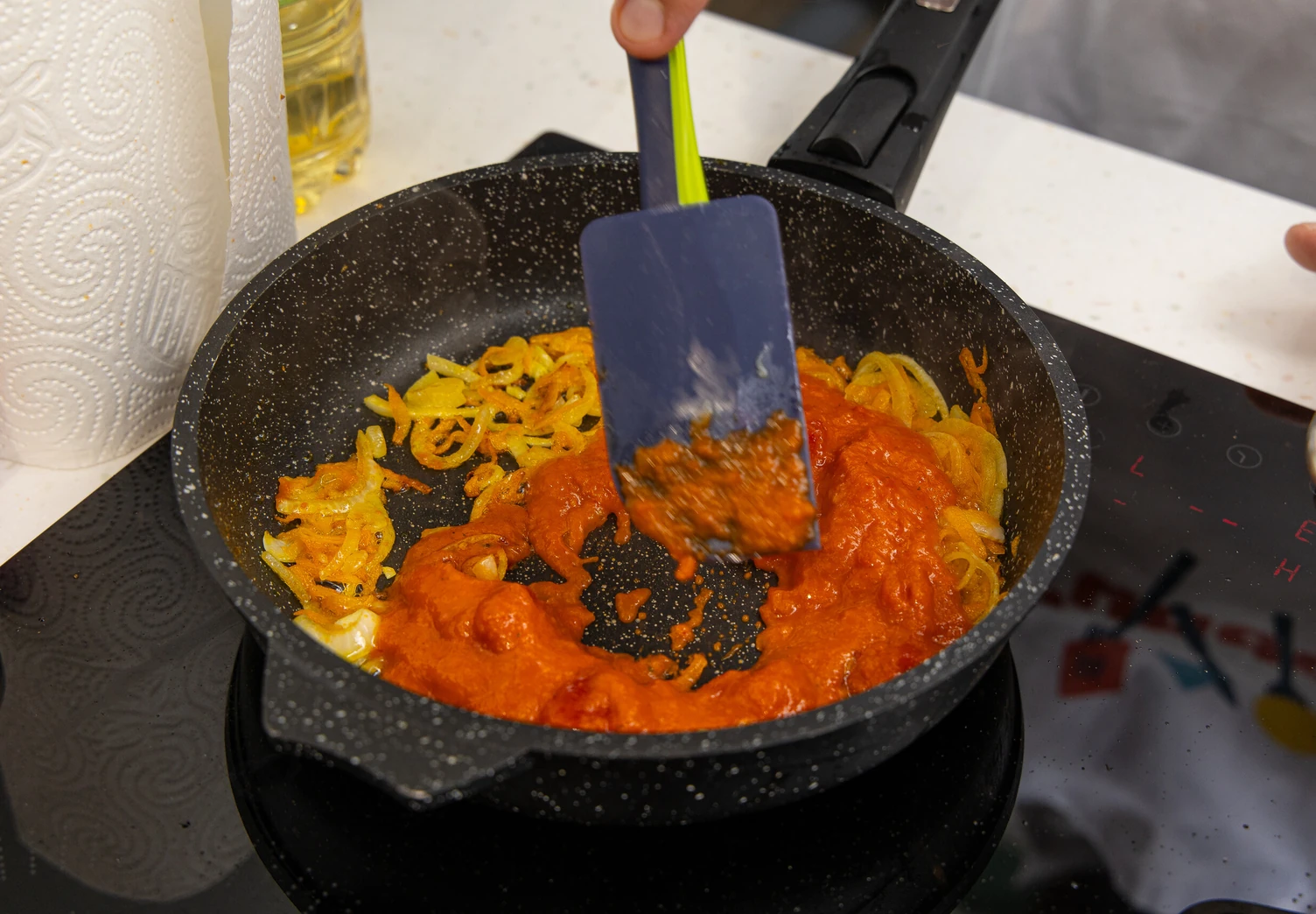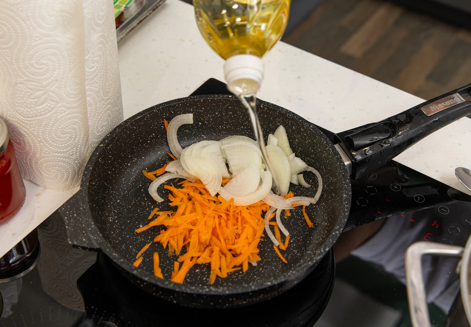 Добавьте в сковороду измельчённый лук и морковь, обжаривайте, пока они не станут мягкими и не приобретут слегка румяный цвет.