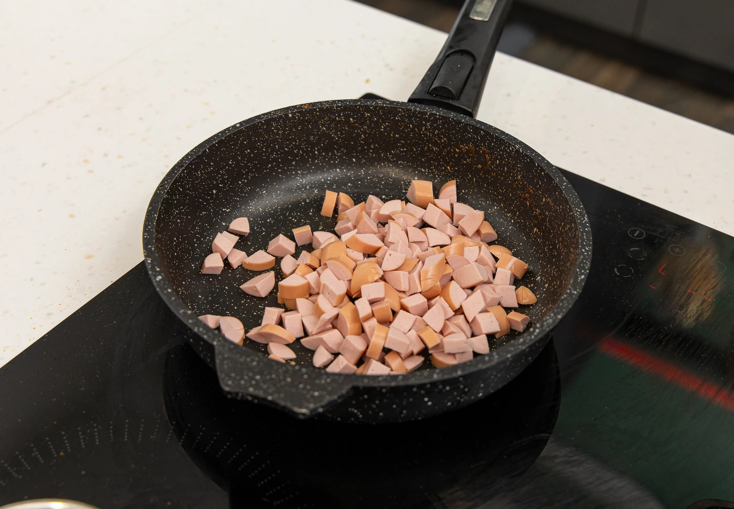 Нарежьте сосиски кружками и обжарьте на отдельной сковороде до золотистого цвета.