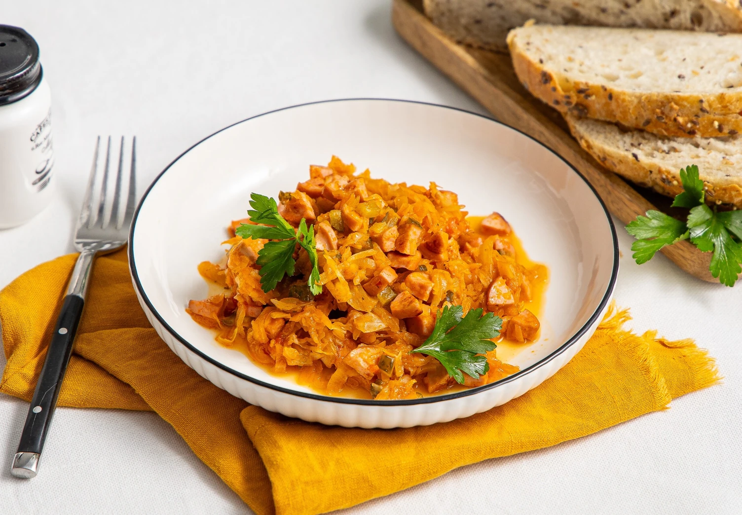 Блюдо со вкусом ностальгии! Такую солянку можно приготовить с сосисками, колбасками, копчёной рулькой или куриным филе. А если заменить часть свежей капусты на квашеную, вкус станет ещё интереснее. Подавайте солянку как самостоятельное блюдо или, следуя любимому рецепту нашего редактора, с картофельным пюре.