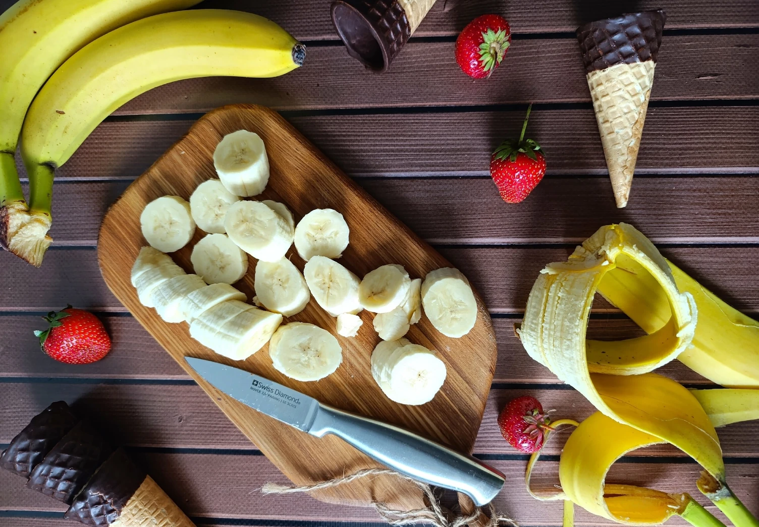 Помойте клубнику и удалите плодоножки. Бананы очистьте и нарежьте кружочками. Измельчите мяту.