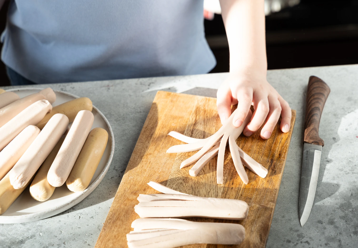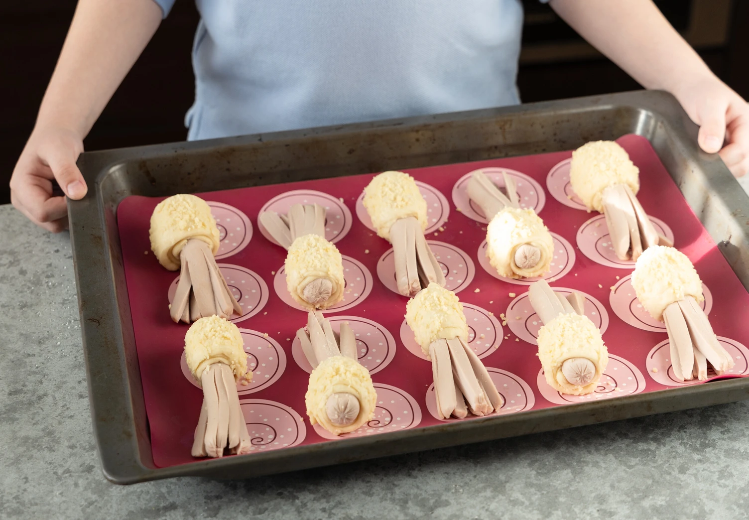Разморозьте тесто согласно инструкции на упаковке. Сосиски очистите от плёнок. Каждую сосиску разрежьте до середины на 3 равные части, затем переверните и разрежьте ещё раз на 3 равные части, половина сосиски при этом должна остаться целой — так у вас получится заготовка с большим количеством «ножек».