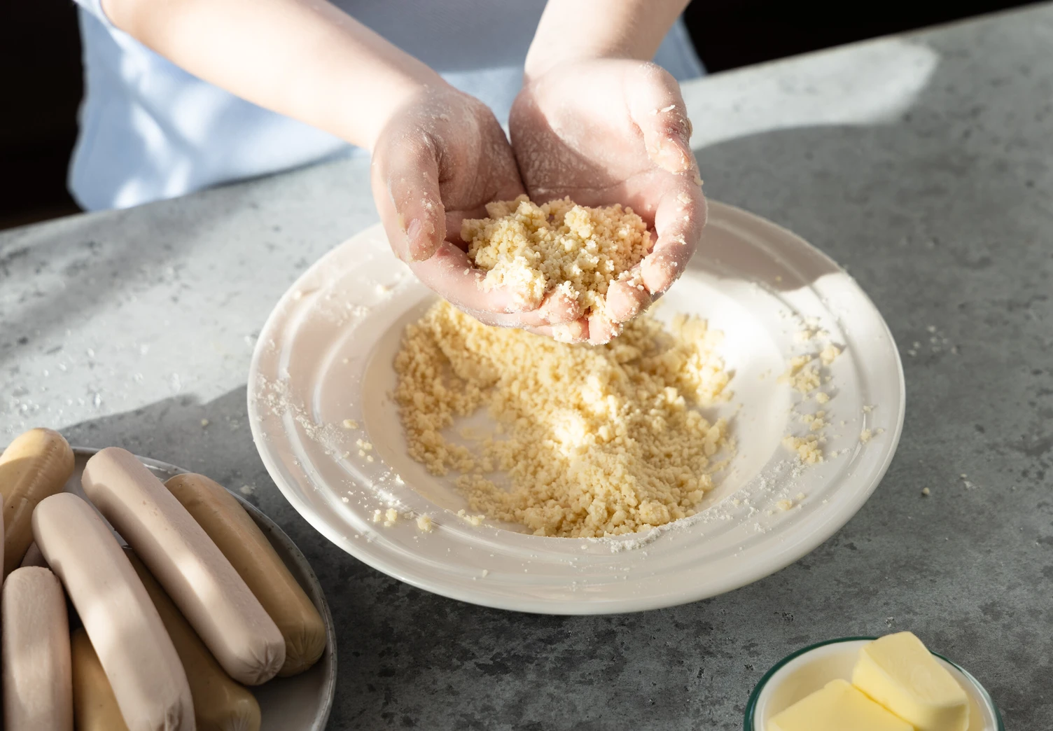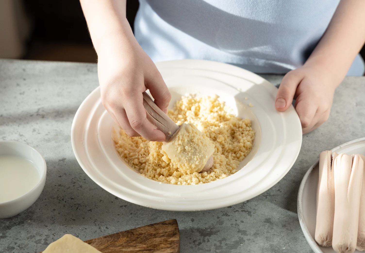 В рецепте используются товары из категорий: Замороженные продукты; Колбаса, сосиски, деликатесы; Молочные продукты, яйцо; Крупы, макароны, мука