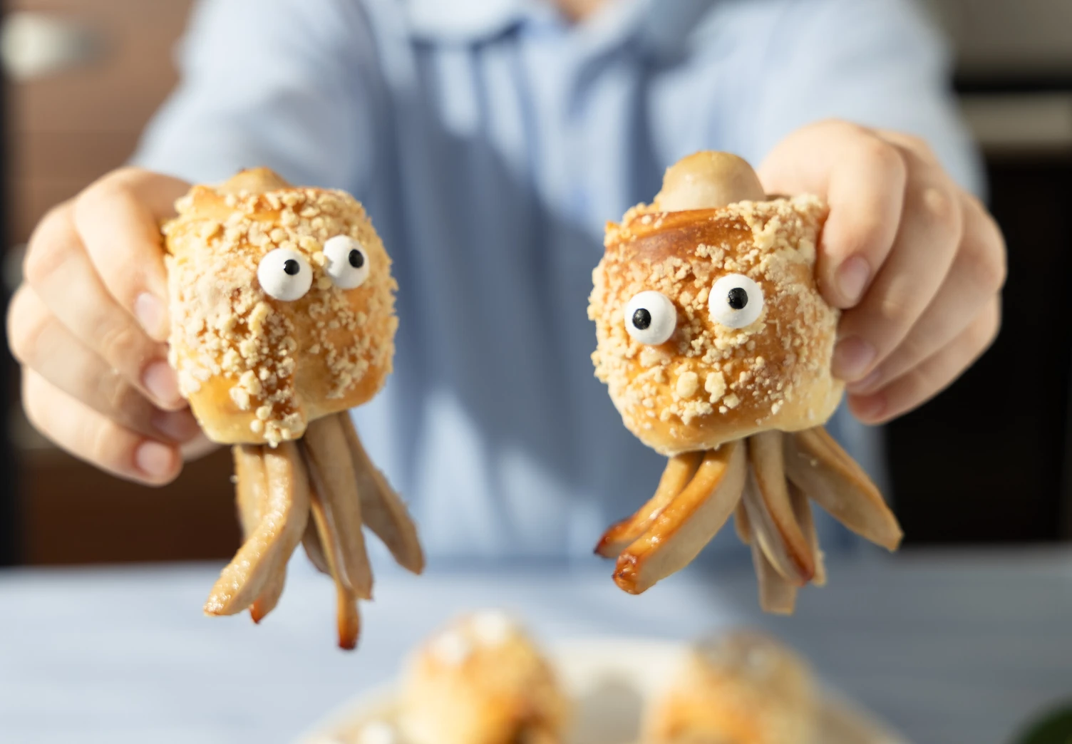 Смешайте сахарную пудру с 1 ч. л. молока и на получившийся раствор приклейте каждому «осьминожке» по 2 глаза — достаточно чуть надавить и подержать 1–2 секунды.