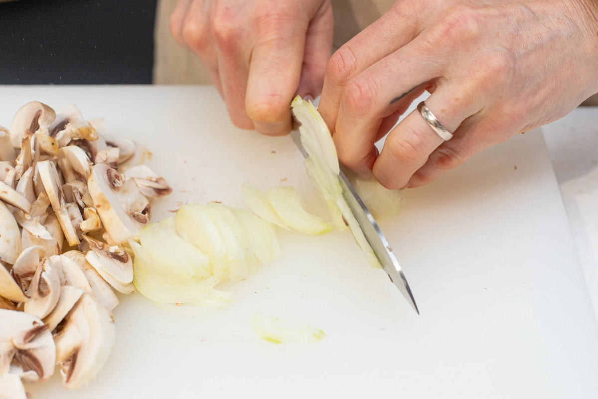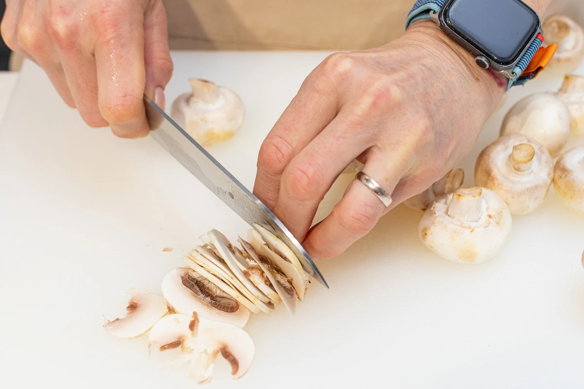 Грибы быстро промойте и обсушите или очистите от грязи, если она есть, щёткой и бумажными салфетками. Нарежьте пластинами.