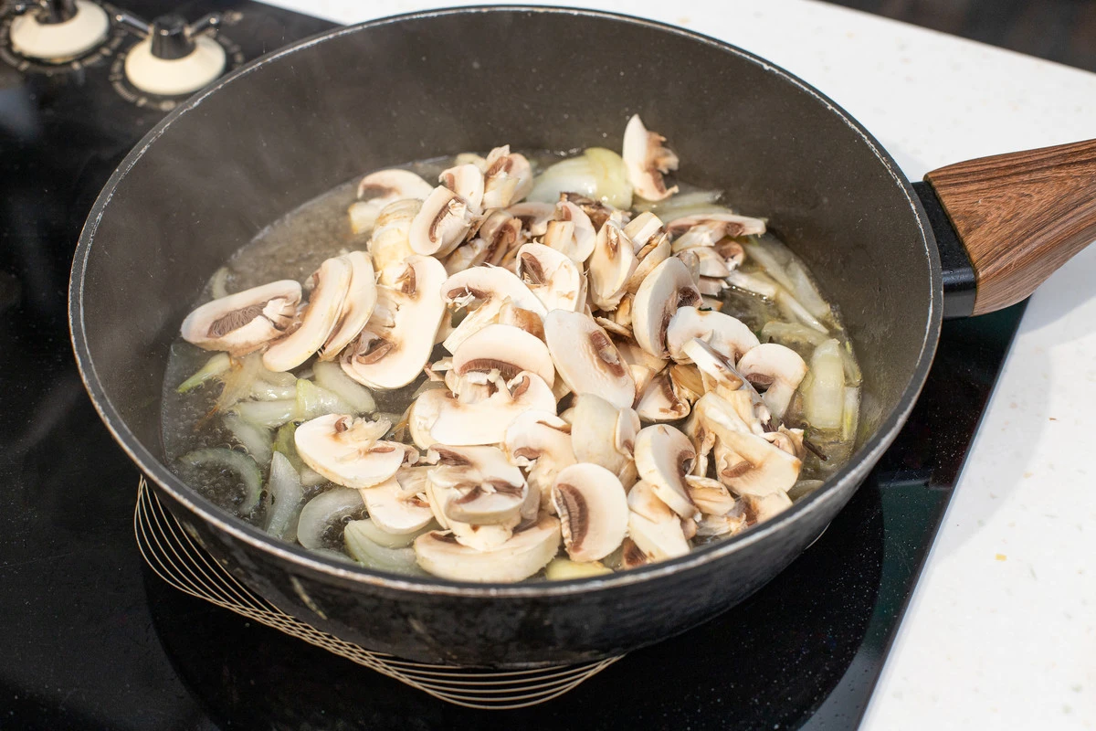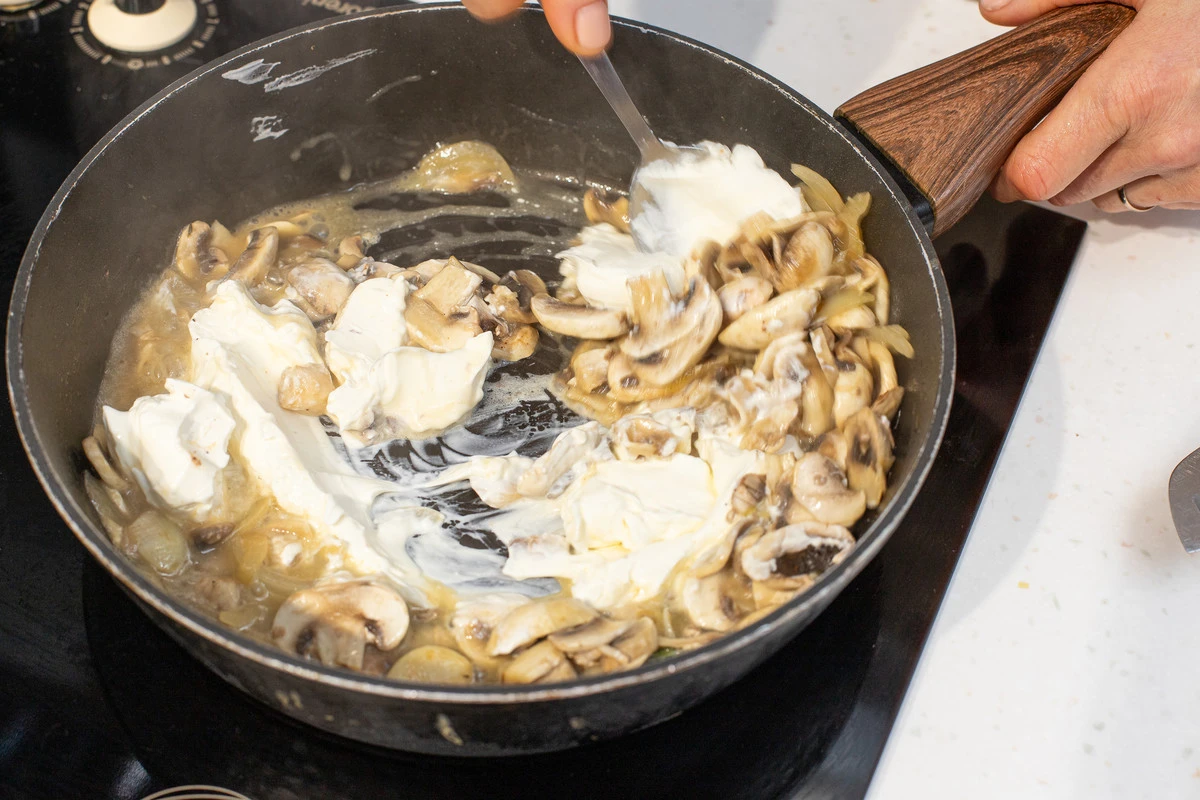 Добавьте сливки и прогрейте, чтобы они растопились и соединились с грибами. Доведите до кипения и снимите с плиты.