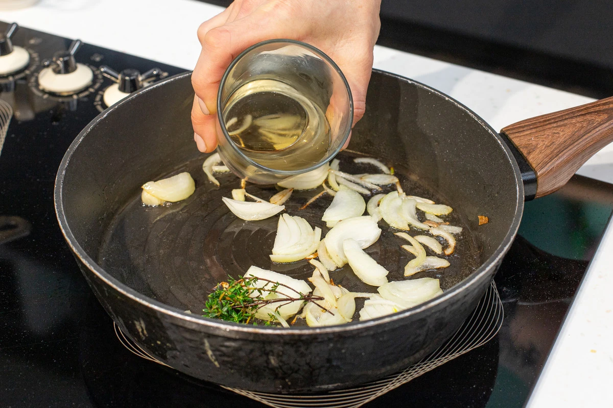 Разогрейте сковороду с 1 ст. л. растительного масла. Выложите лук, чеснок, веточку тимьяна и готовьте 5-7 минут. Затем влейте вино и готовьте ещё пару минут.