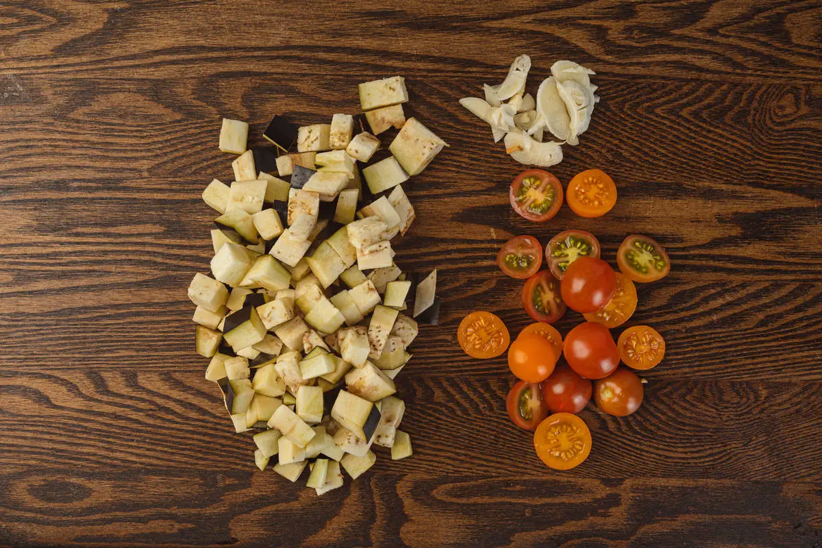 Поставьте кипятиться воду для спагетти в большой кастрюле. Баклажан нарежьте мелкими кубиками, чеснок — тонкими слайсами, черри разрежьте пополам. Измельчите петрушку.