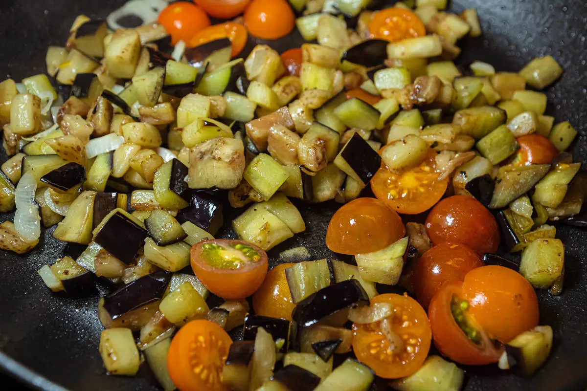 Обжарьте баклажан с чесноком до золотистости, добавьте черри, прогрейте ещё минуту.